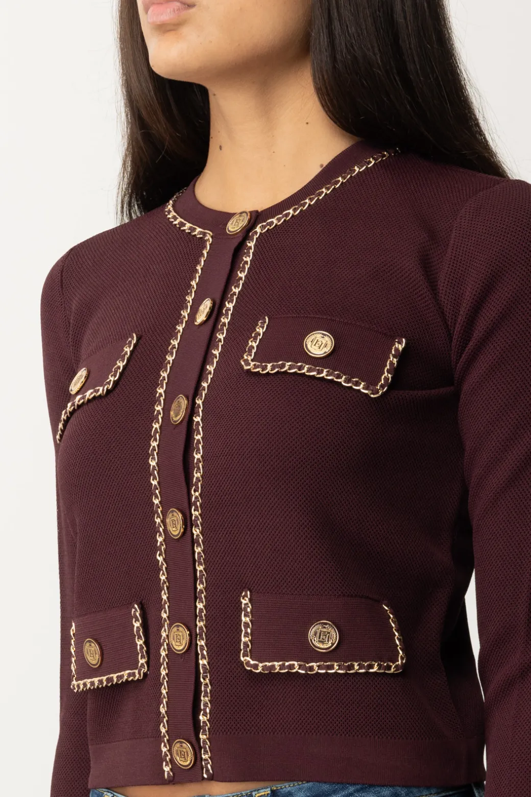 Grazioso e bon-ton cardigan in viscosa Elisabetta Franchi, dal taglio cropped, abbellito dal’applicazione di catenelle dorate lungo i profili e sulle pattine delle tasche frontali. Un capo delizioso, da indossare sia in combinazione con altri top, che come top a sè, per apportare una nota di femminilità ai tuoi look con semplicità.