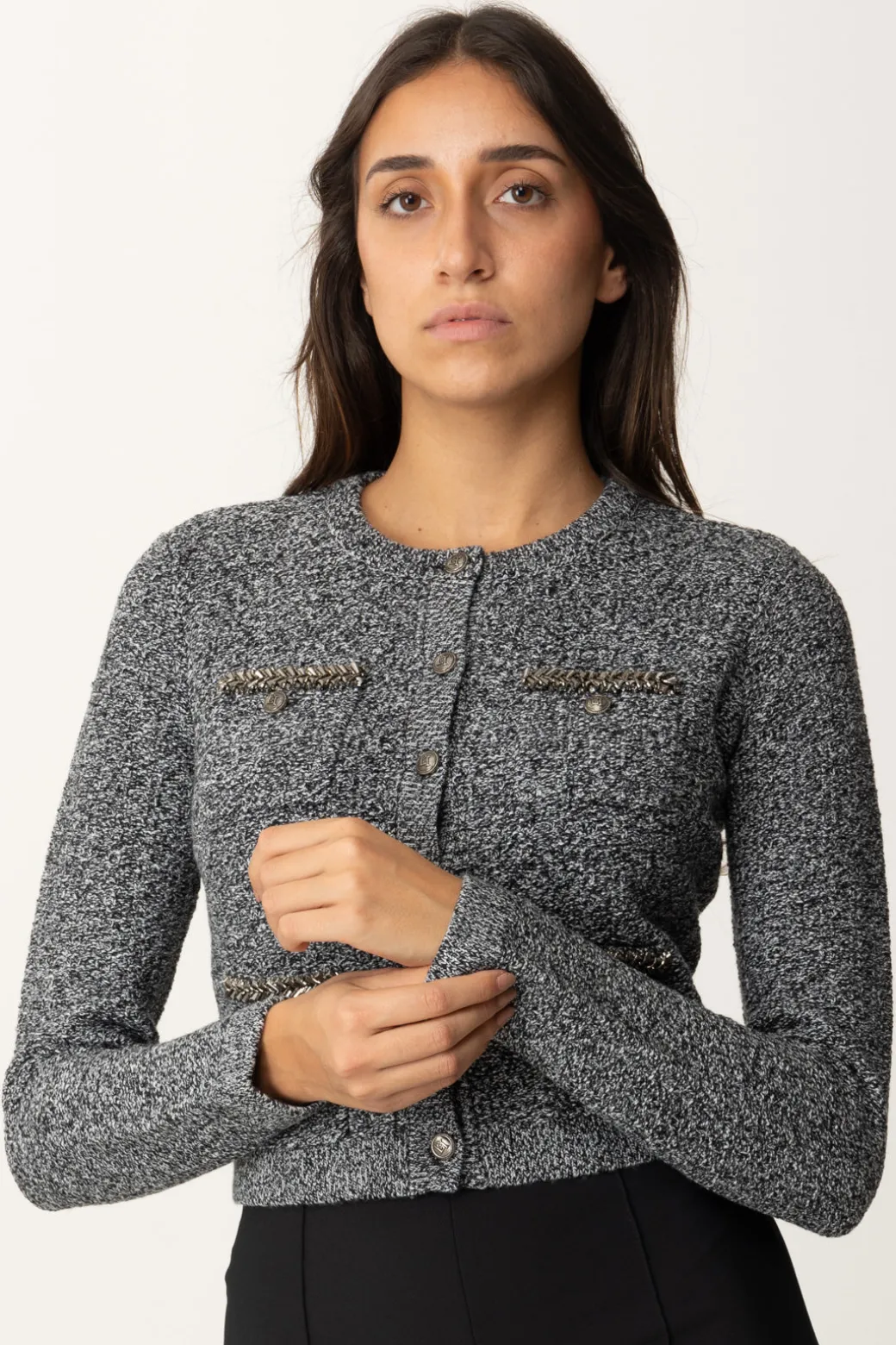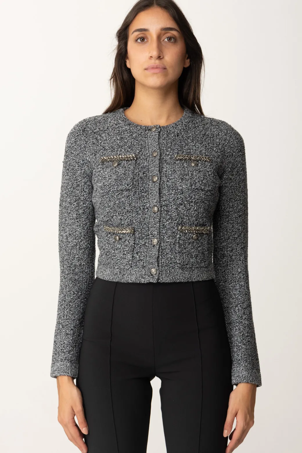 Un cardigan Elisabetta Franchi realizzato in misto lana bouclé, dal taglio corto e tasche a toppa impreziosite da ricami di perline che aggiungono un fascino glamour ed elegante all’intero look. Da abbinare a pantaloni a vita alta per un look chic e alla moda.