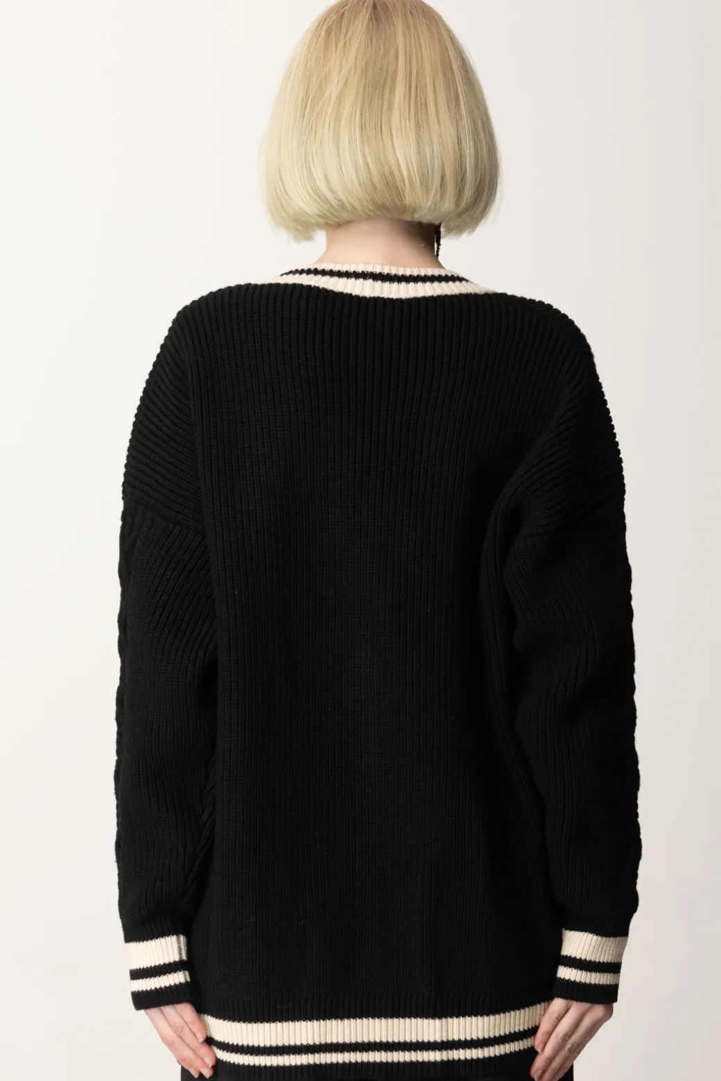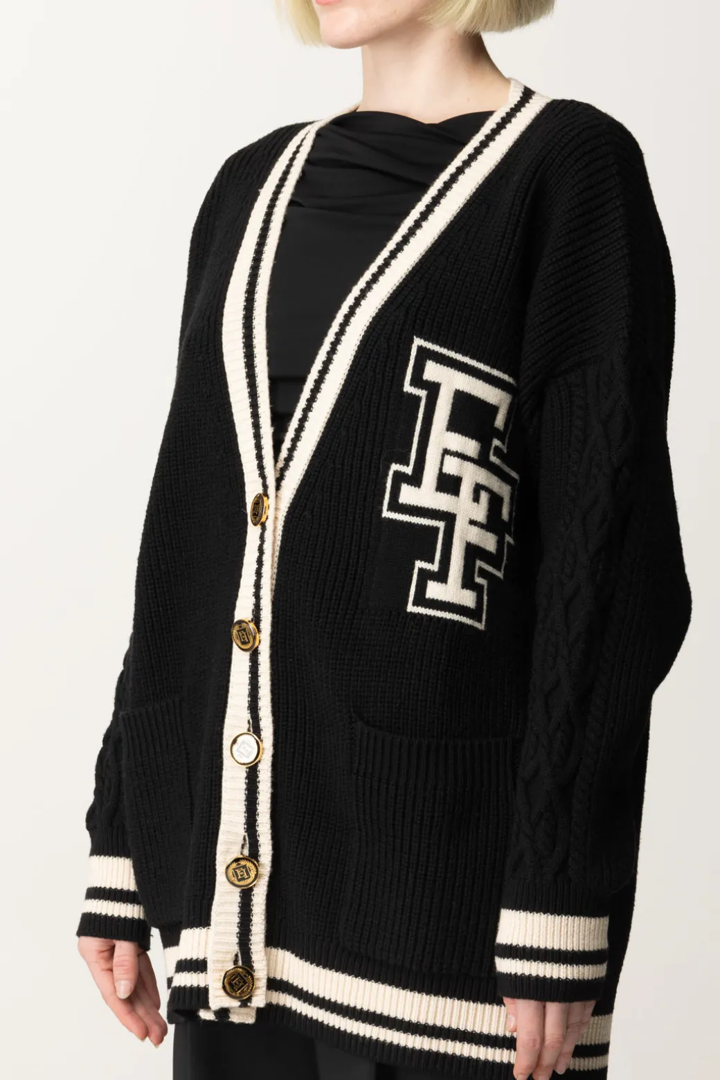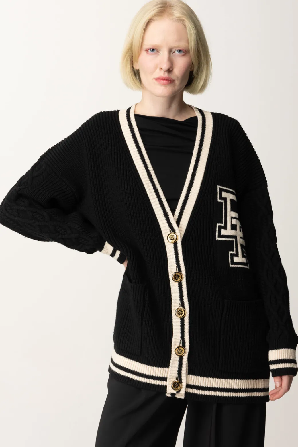 Cardigan in lana a maniche lunghe con finiture in contrasto colore. È caratterizzato da spalla scesa, abbottonatura monopetto bassa e maxi lettere jacquard stile college.