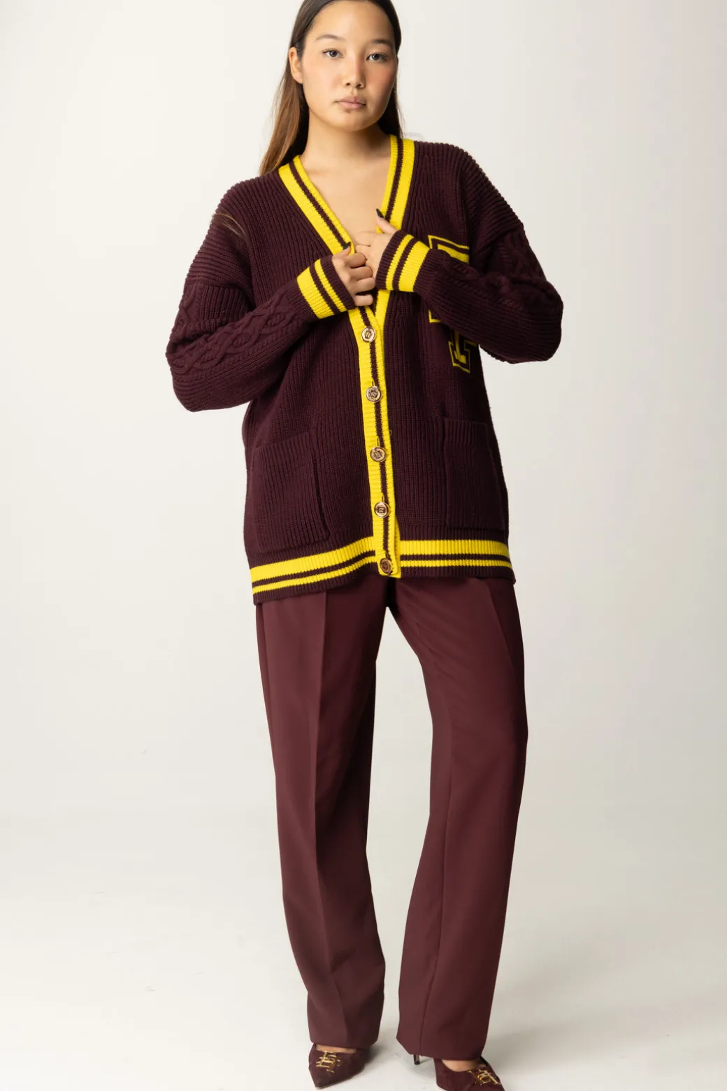 Cardigan in lana a maniche lunghe con finiture in contrasto colore. È caratterizzato da spalla scesa, abbottonatura monopetto bassa e maxi lettere jacquard stile college.