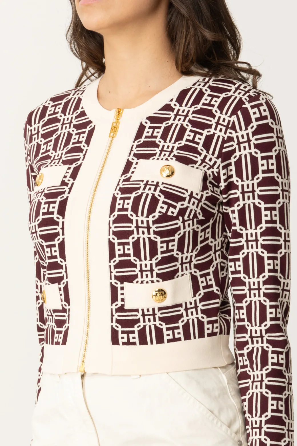 Un cardigan Elisabetta Franchi sofisticato e contemporaneo grazie alla chiusura full zip che ne attualizza la silhouette elegante ed aderente. Profili a contrasto di colore, così come la stampa logo jacquard, e punti luce dati dai bottoncini dorati sul fronte che simulano la presenza di taschine: un top perfetto da indossare anche come maglia, per i tuoi outfit da ufficio e da tempo libero.