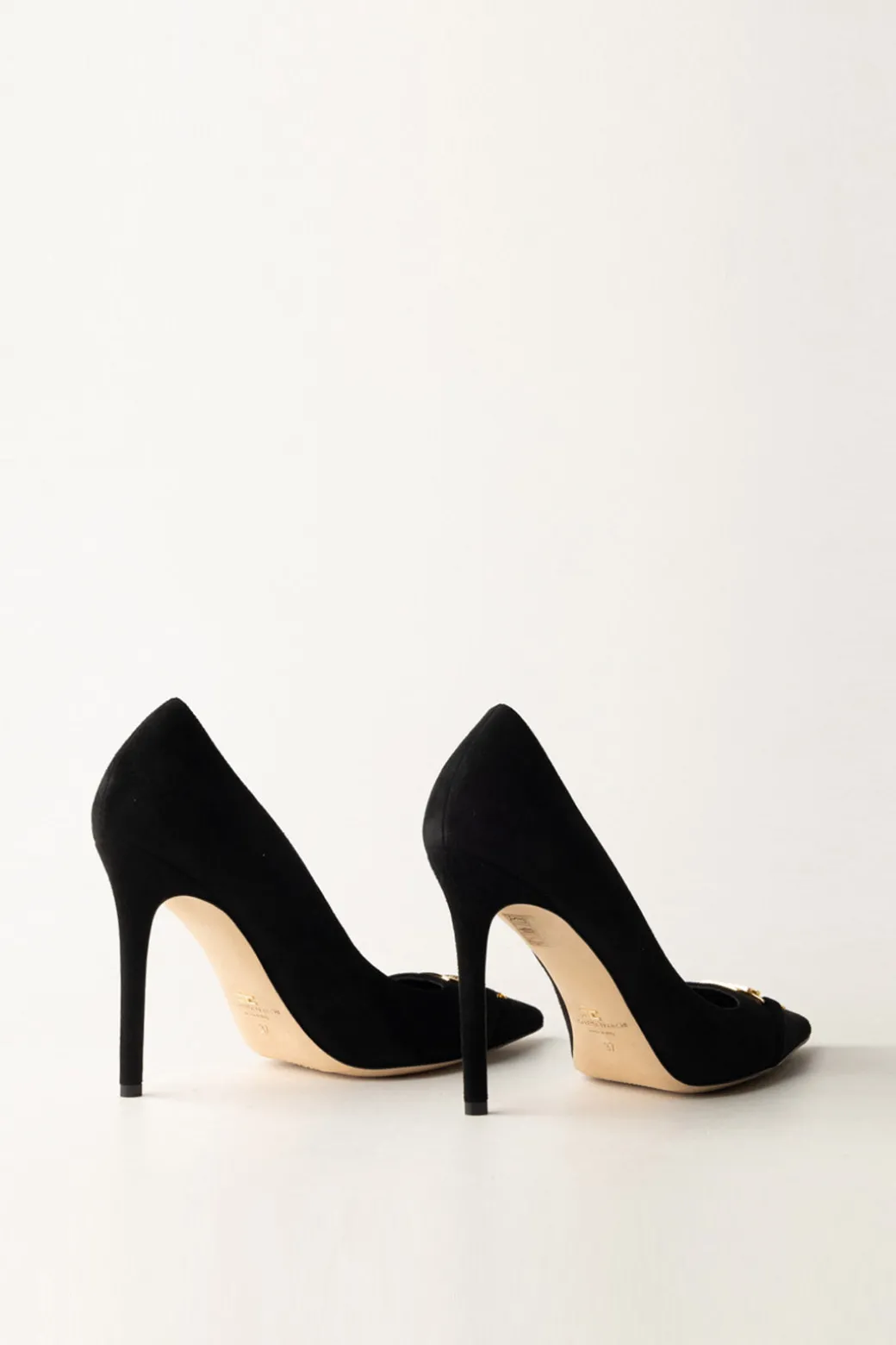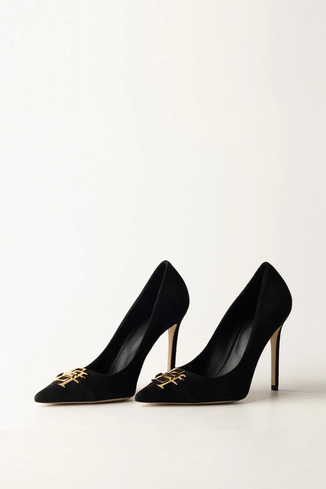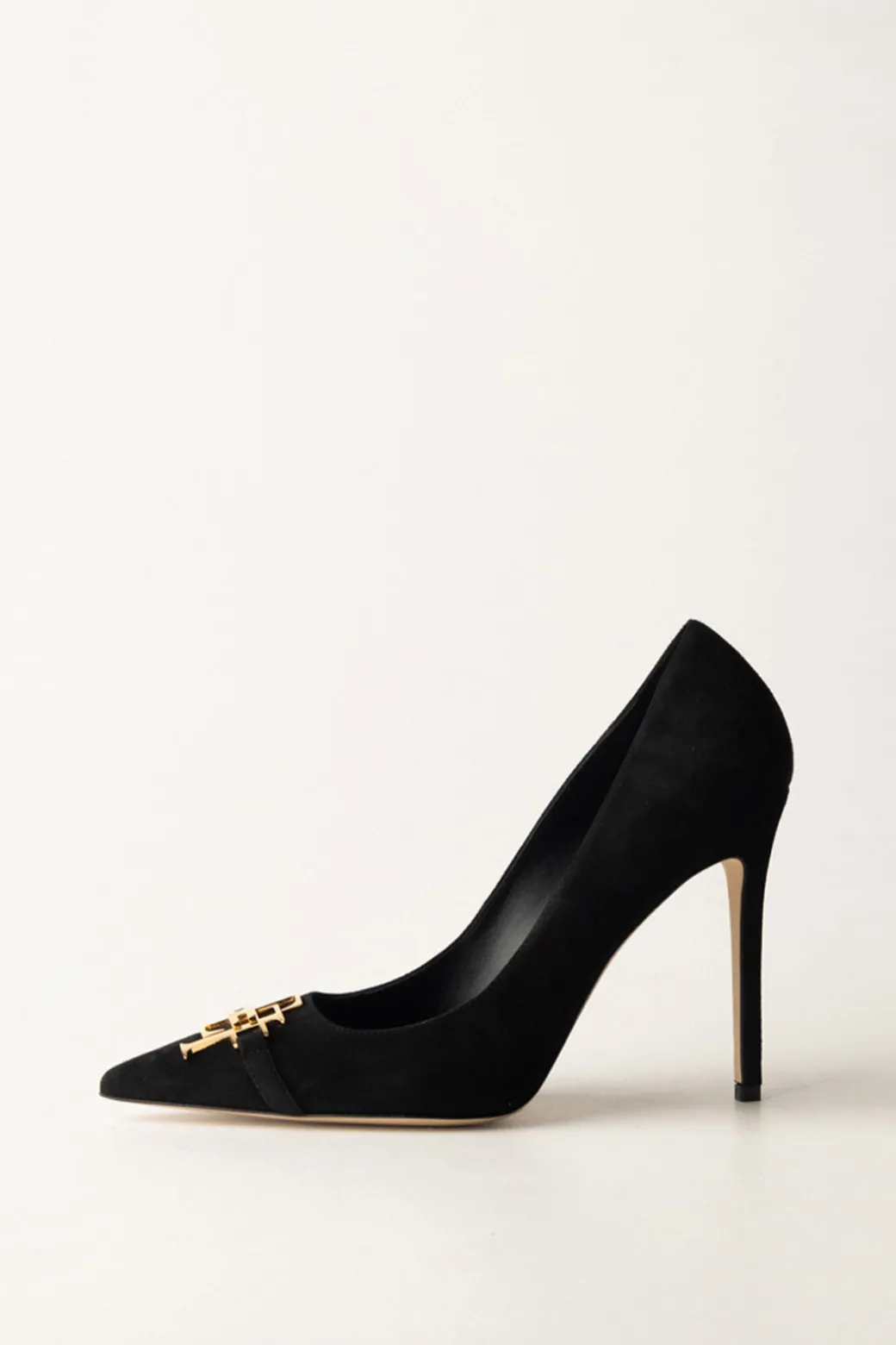 Chic e sofisticate: sono le décolleté Elisabetta Franchi realizzate in camoscio e con tacco a stiletto, impreziosite da una maxi placca logo in metallo dorato che aggiunge luce. Saranno il complemento perfetto per un look elegante e audace.