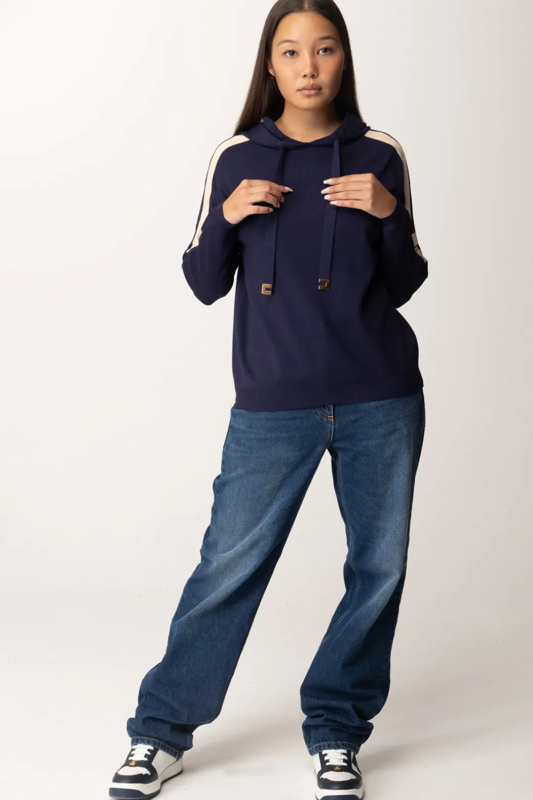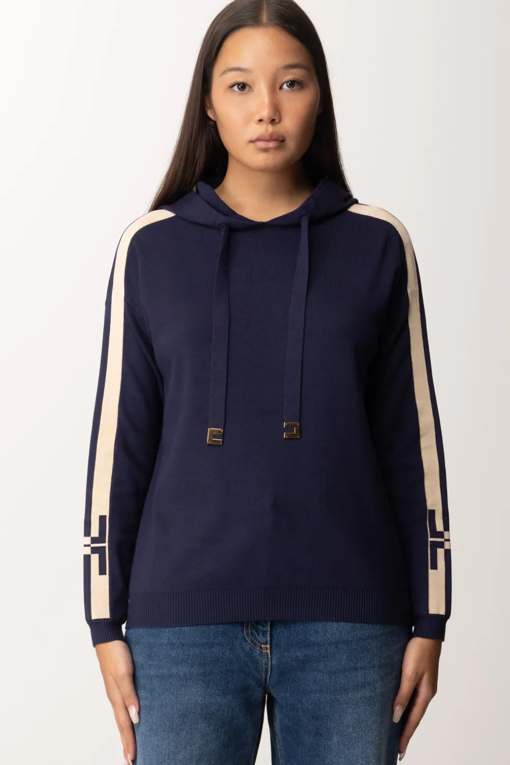 Felpa Elisabetta Franchi realizzata in maglia di viscosa, morbida sul busto e versatile per i tuoi look da giorno e tempo libero. Cappuccio sulle spalle con coulisse dai terminalini logati in oro, sulle maniche lunghe presenta delle bande con logo a contrasto di colore che la connettono ad altri capi più o meno casual della collezione.