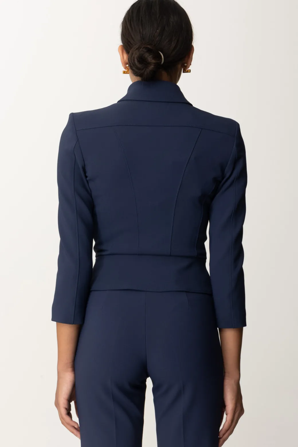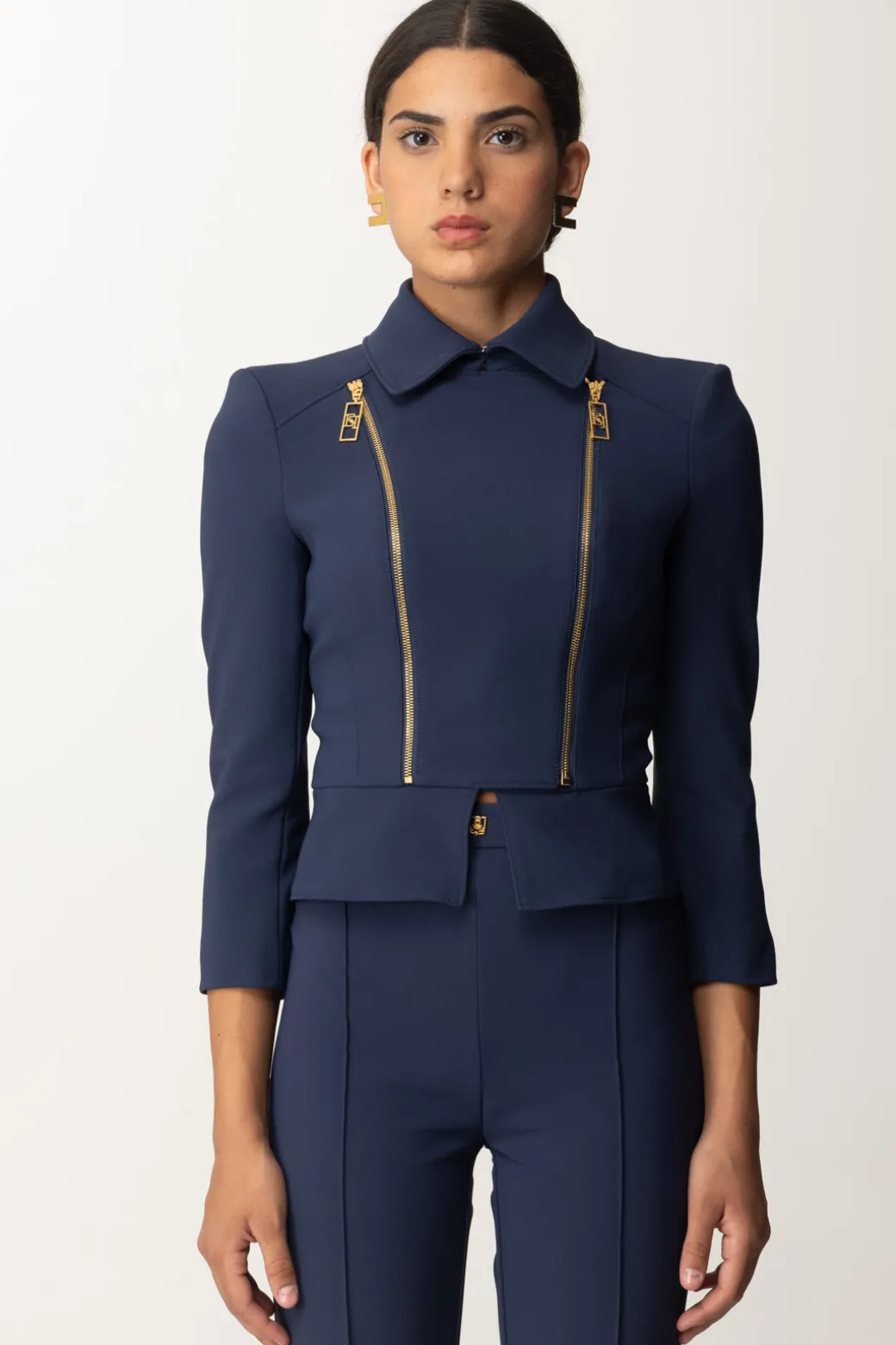 Giacca Elisabetta Franchi in doppio crêpe stretch ideale per delineare la silhouette. Viene impreziosita da dettagli come la doppia zip e la baschina al fondo. Moderna ed elegante, sopra jeans o pantaloni farai sempre un figurone!