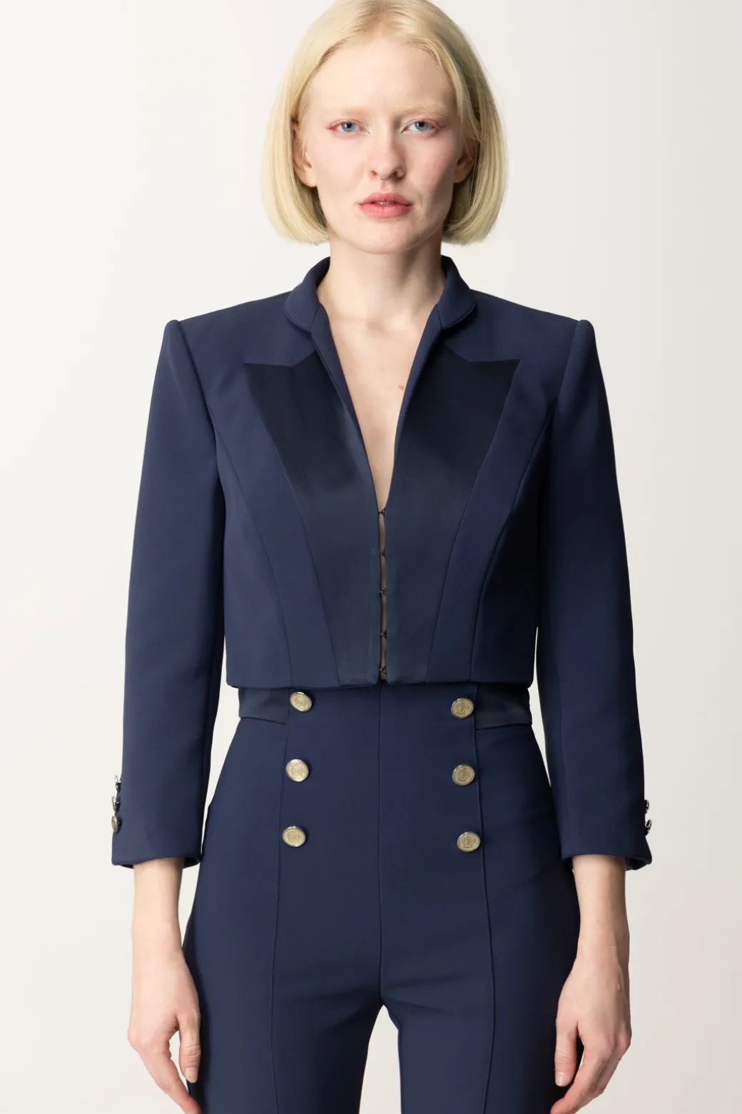Questa giacca corta Elisabetta Franchi è realizzata in crêpe stretch, offrendo una vestibilità aderente che enfatizza il punto vita Il design monopetto con chiusura a gancetti presenta raffinati revers in raso, conferendo un tocco di eleganza al capo. Le maniche a 3/4 sono arricchite da inserti in raso sui polsini e una delicata ricamatura tono su tono del logo. Ideale per completare outfit sofisticati, questa giacca aggiunge classe e stile a qualsiasi guardaroba, e al contempo un tocco fresco e giovanile.