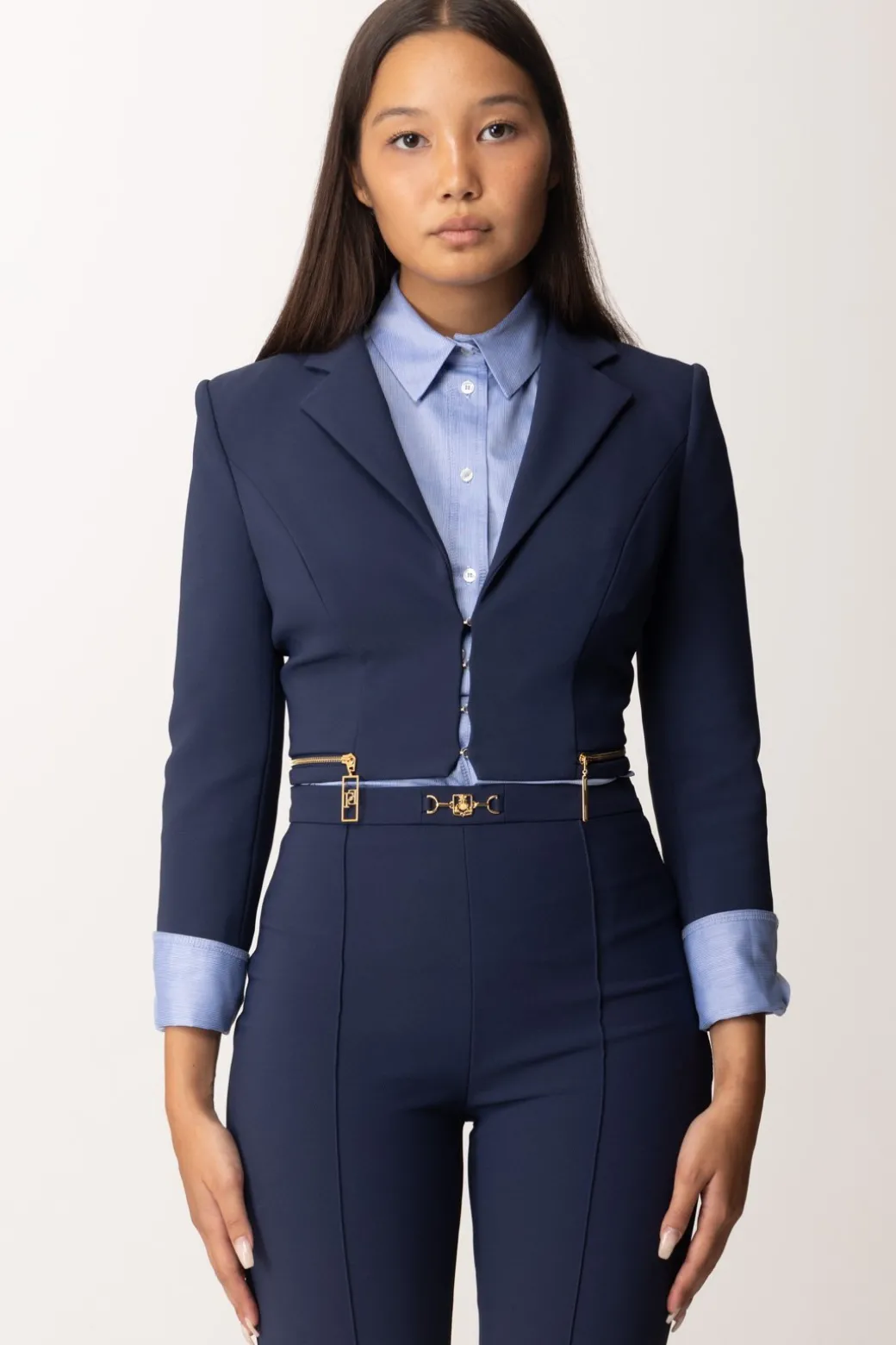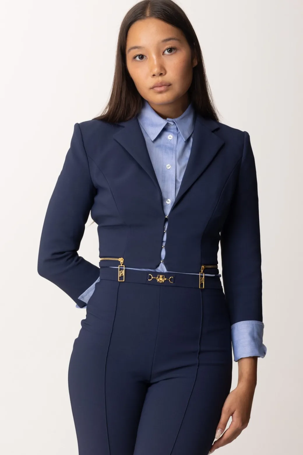 Un po’ un leit motiv di questa collezione, le zip con tiretto logato compaiono anche su questa giacca crop Elisabetta Franchi, intorno al punto vita. Chiusura a gancetti e maniche a tre quarti, un capospalla non banale da abbinare con facilità a tantissimi bottom a vita alta.