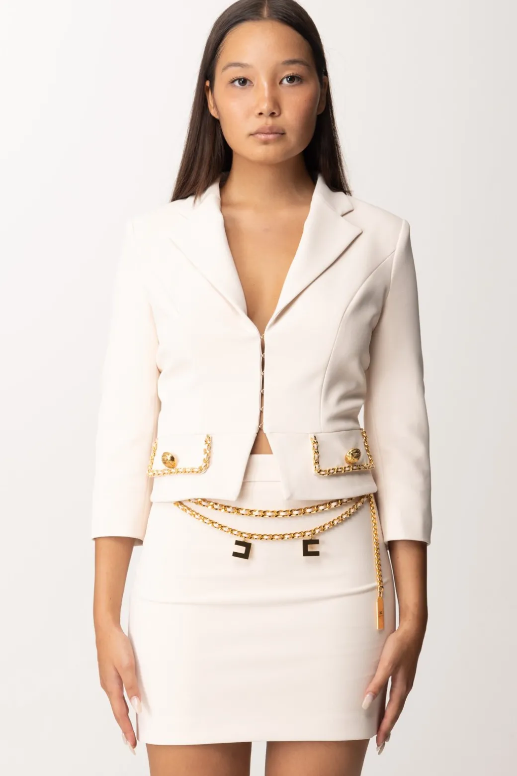 Giacca Elisabetta Franchi dall’allure sofisticato, realizzata in crêpe stretch con maniche a 3/4 e chiusura monopetto. La baschina è illuminata dettagli in catena gold con un effetto pelle che aggiunge un tocco edgy. Da abbinare a pantaloni a vita alta o jeans per look casual o eleganti.