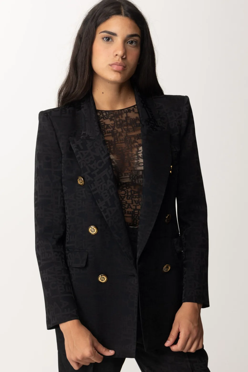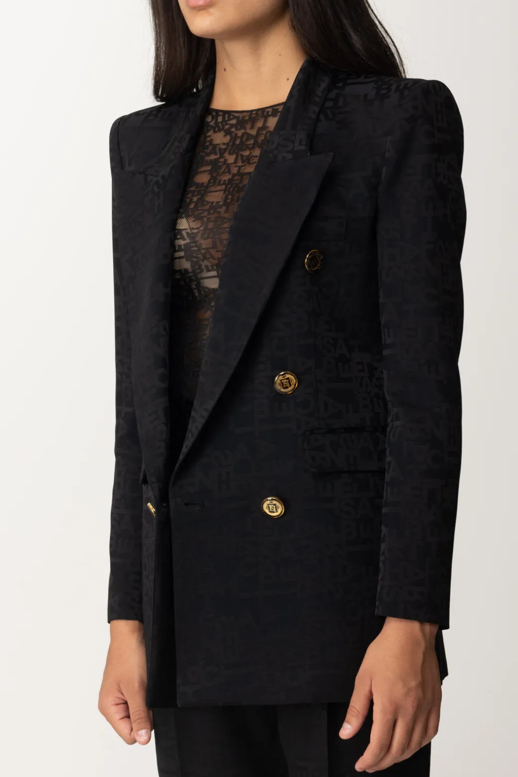 Sofisticata e strutturata: questa giacca Elisabetta Franchi dal design doppiopetto in crêpe jacquard, è impreziosits dal tessuto in lettering, revers a lancia e spalle definite. Tutti questi dettagli la rendono perfetta per un look di classe e moderno.