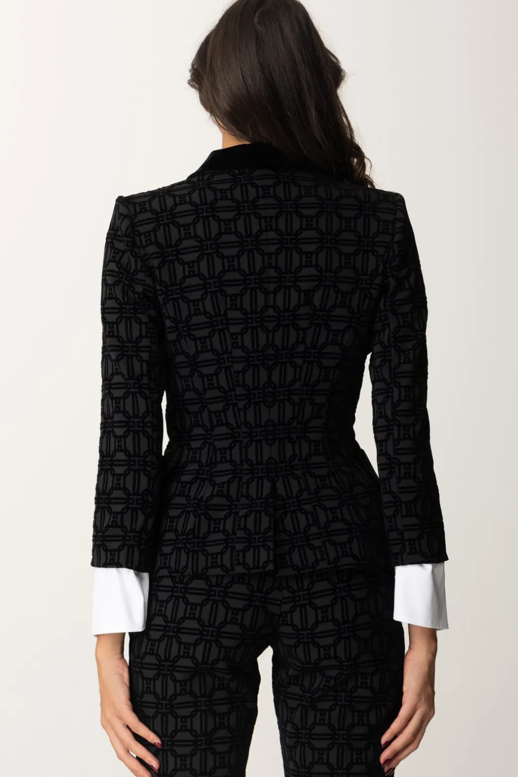 Una Giacca doppiopetto Elisabetta Franchi dal fascino senza tempo. A renderla unica è il pattern monogram in flock che richiama i dettagli in velluto sui revers e tasche frontali e le maniche con polsini bianchi a contrasto che creano un effetto sartoriale impeccabile. Scegli pantaloni eleganti o gonne pencil per un look sofisticato e ricercato.