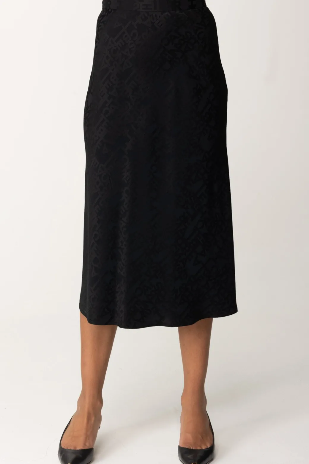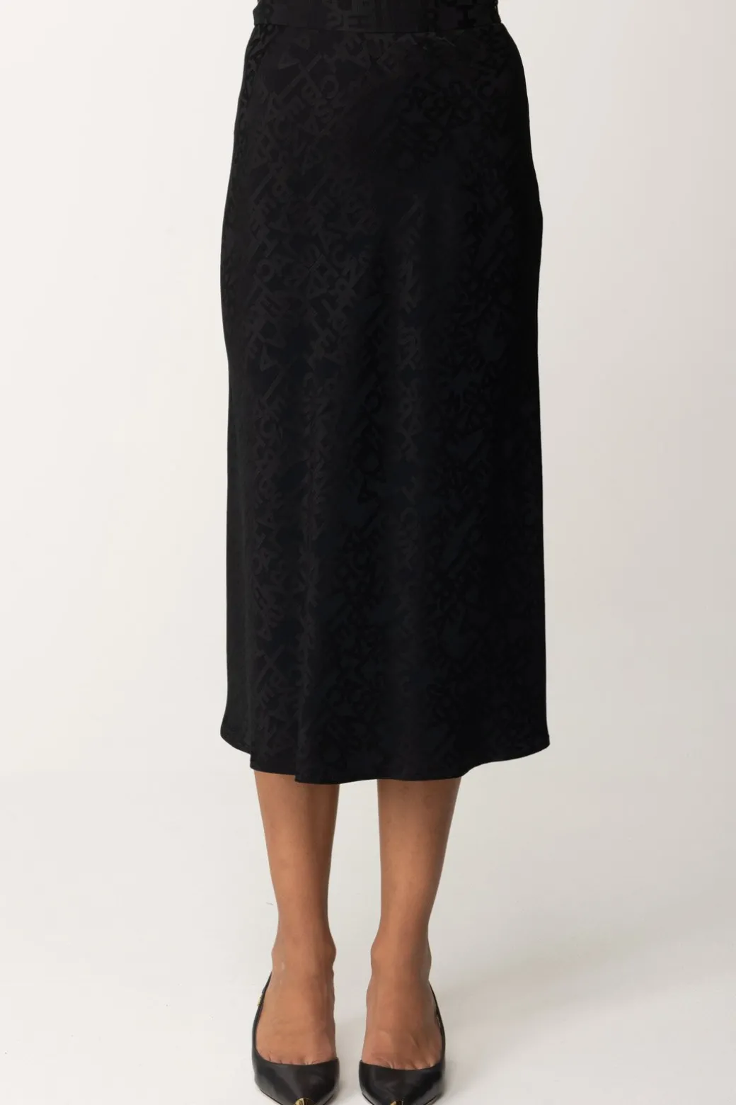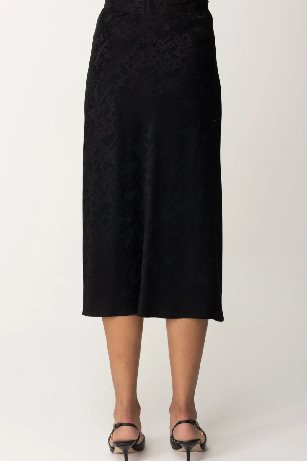 Raffinata e moderna, questa gonna Elisabetta Franchi dal taglio midi leggermente svasata al fondo, è realizzata in crêpe jacquard con una stampa lettering, ideale per un look sofisticato che non passa inosservato.