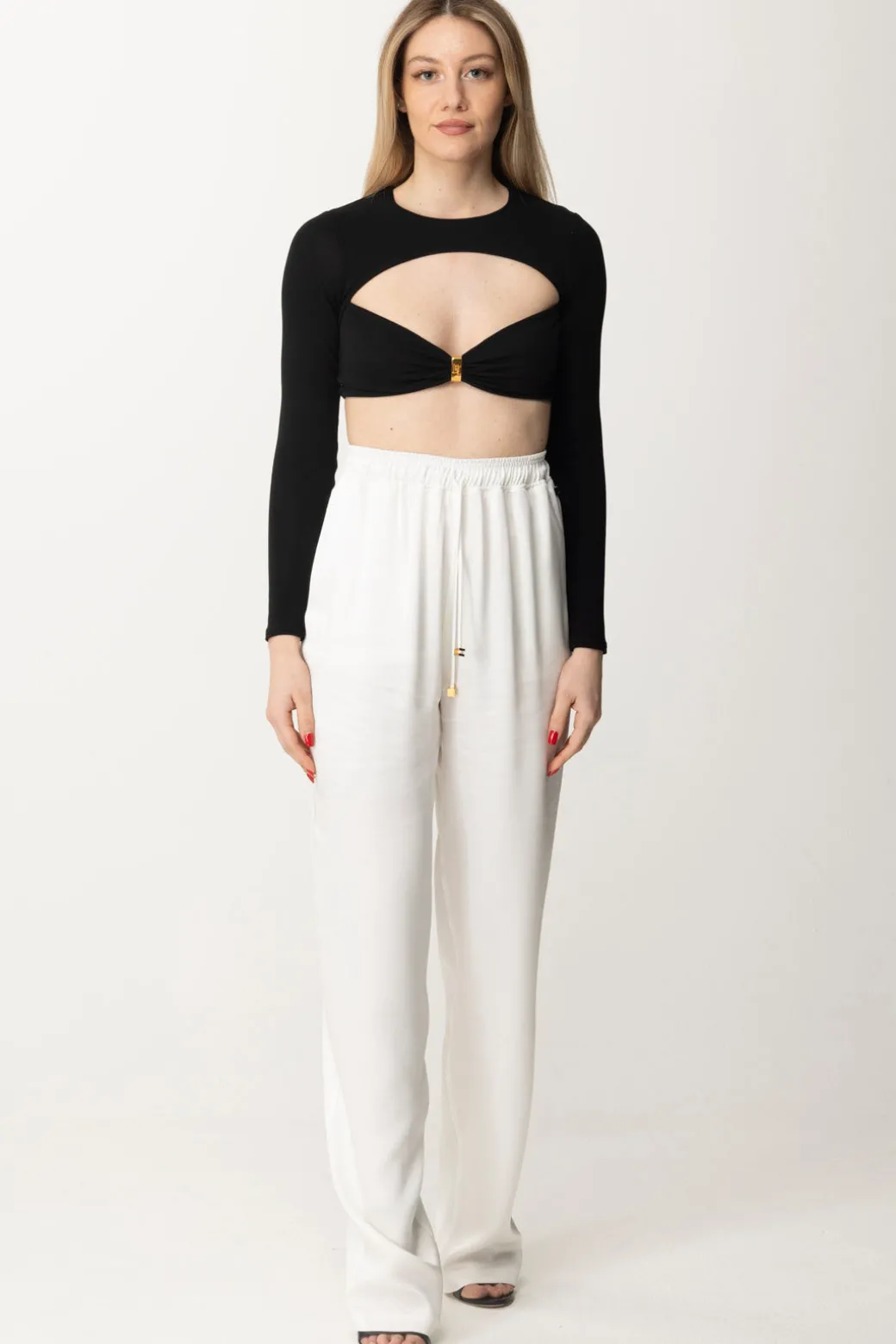 Questa maglia cropped in jersey crêpe di Elisabetta Franchi dalle maniche lunghe e la linea aderente, presenta un incantevole dettaglio arricciato sul davanti completato da un piccolo gioiello che aggiunge un tocco di sofisticata luminosità. Perfetta per chi ama esprimere il proprio stile con capi che catturano l’attenzione, questo top è ideale per completare un outfit dal carattere deciso e femminile.