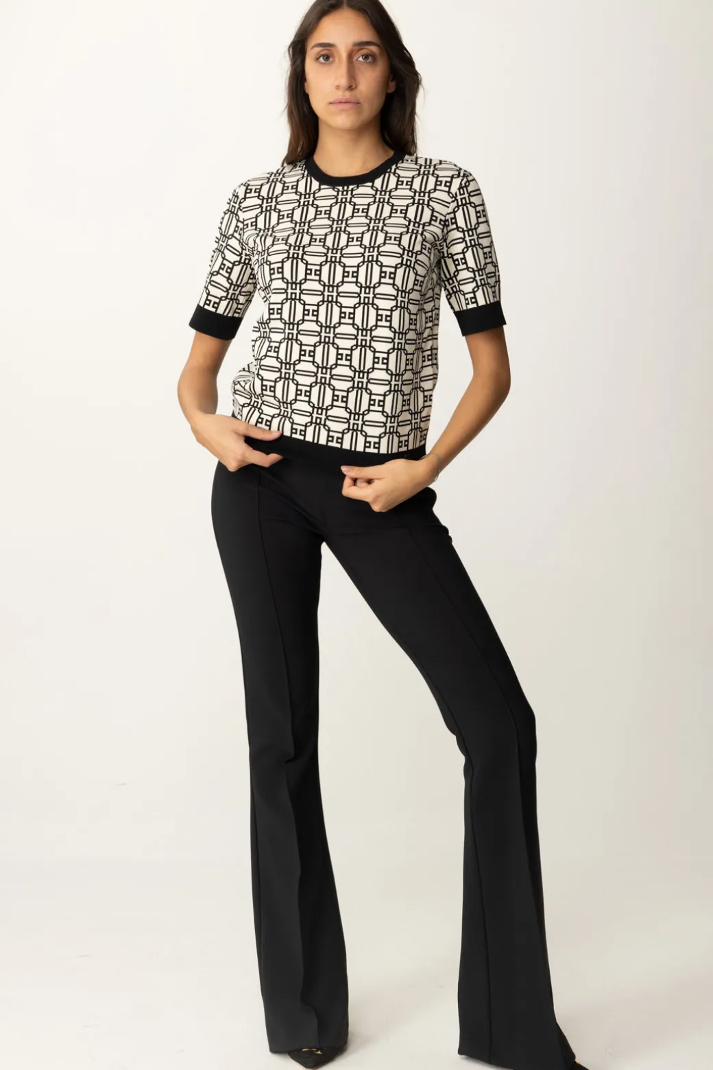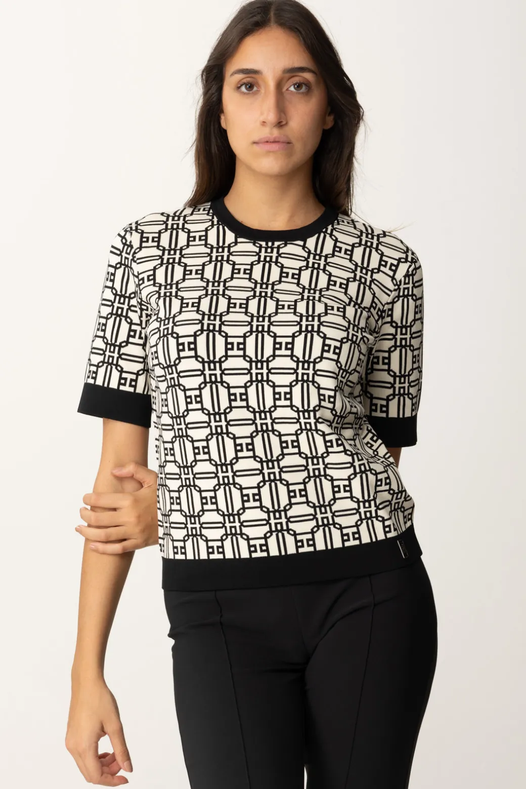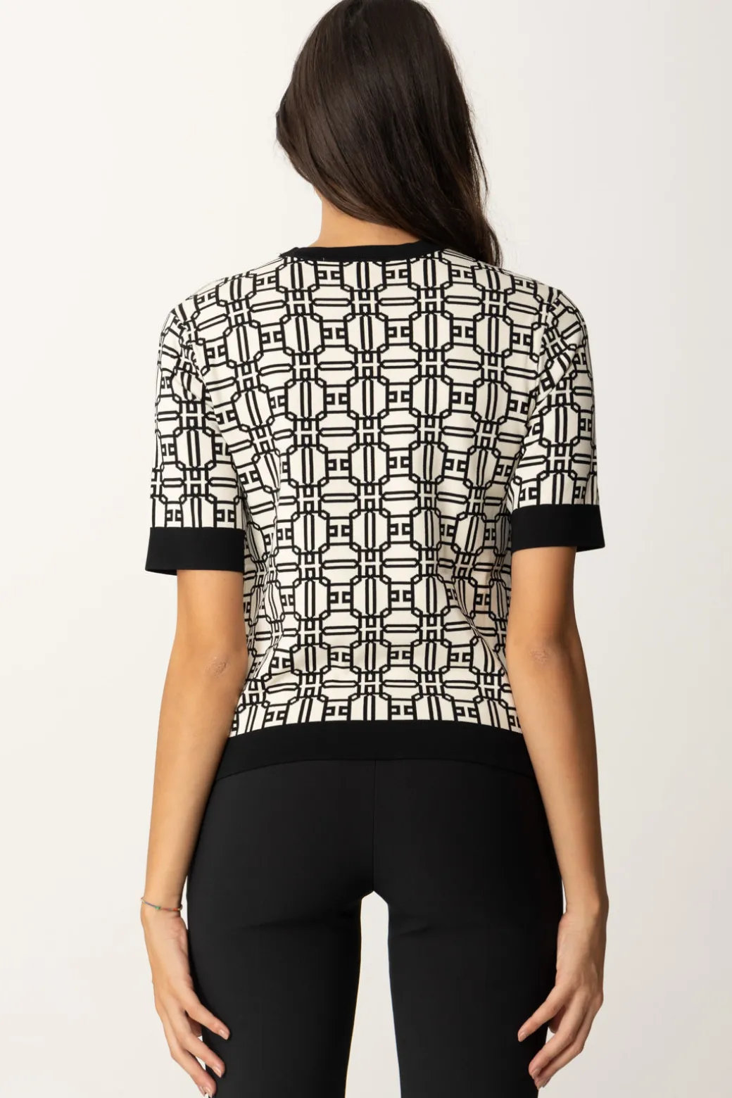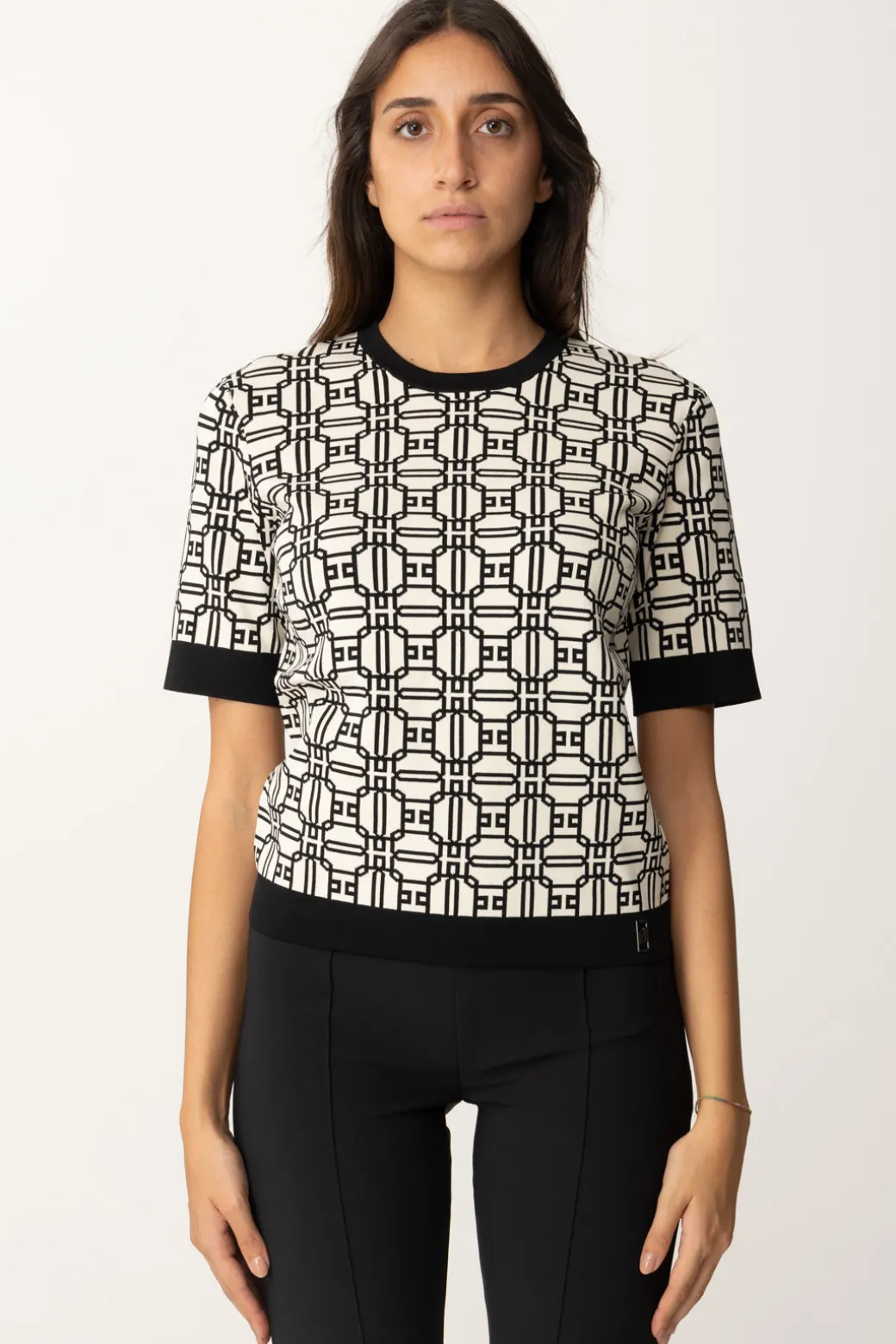 Questa maglia Elisabetta Franchi in misto viscosa, ha come protagonista la stampa logo, ed è perfetta per chi ama i dettagli grafici e moderni. Da abbinare a pantaloni o gonne a vita alta per uno stile sofisticato.