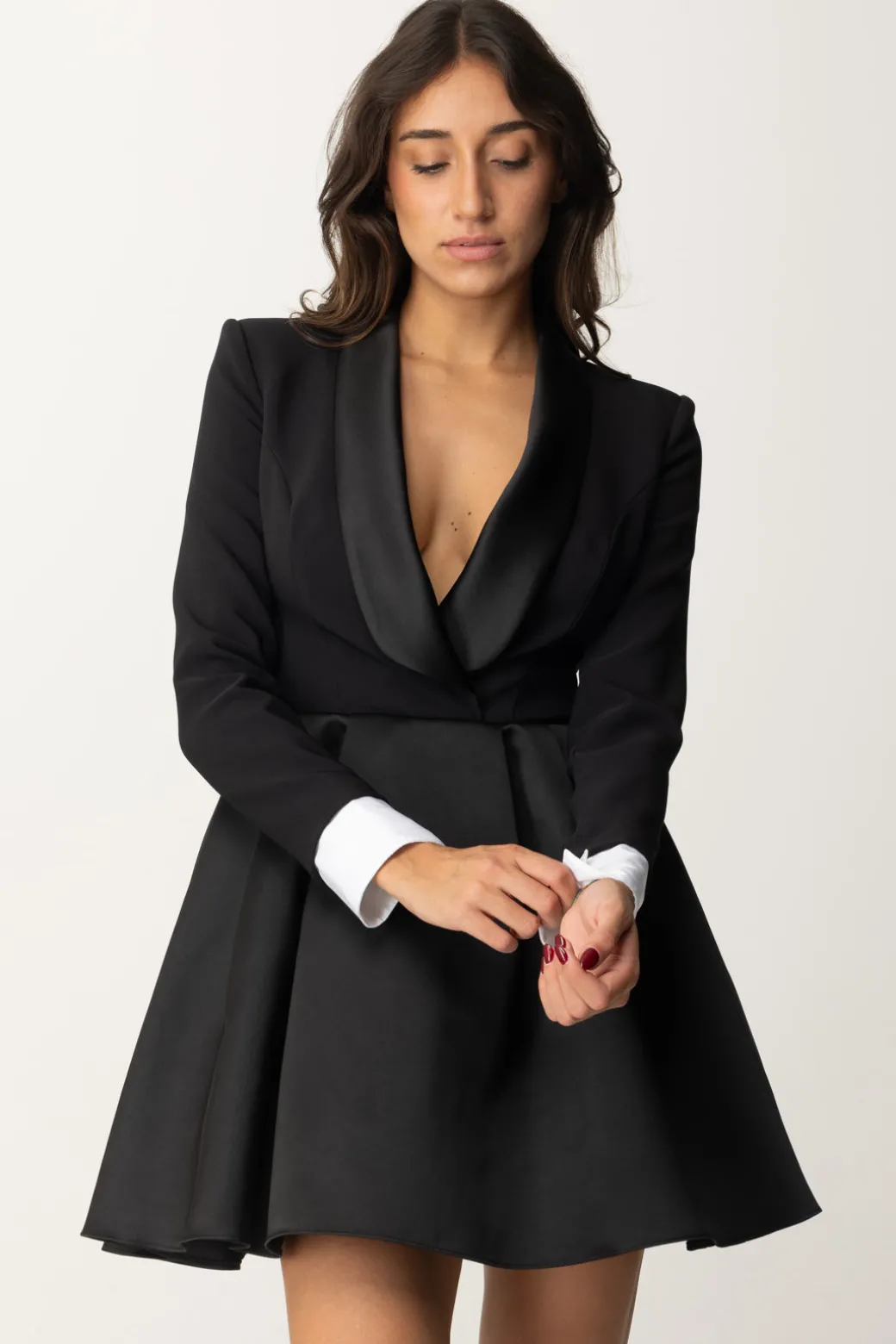 Mini abito Elisabetta Franchi assolutamente elegante e assolutamente originale: la parte alta presenta maniche a tre quarti con polsini a contrasto staccabili e revers in raso, così come in raso è la minigonna a maxi pieghe che completa la tua mise. Un vero cocktail dress, con l’augurio che tu possa indossarlo tante e tante volte!