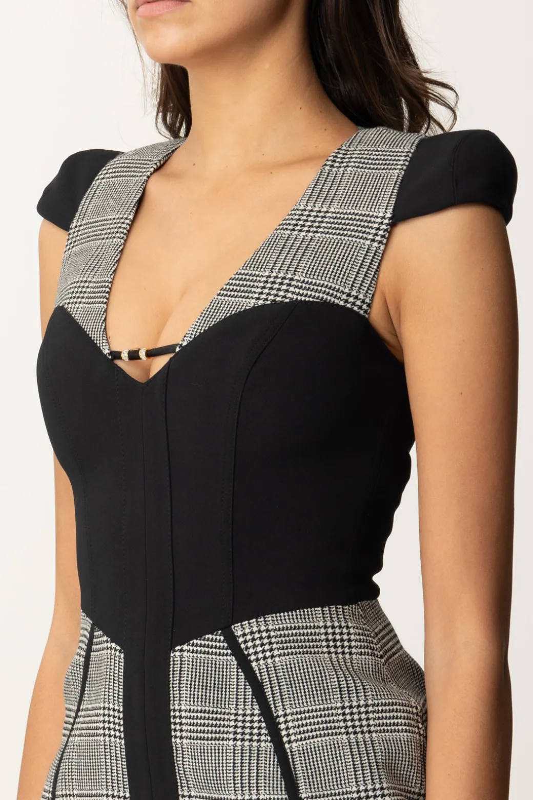 Questo Miniabito Elisabetta Franchi realizzato in fresco lana principe di Galles, presenta un top bustier dallo scollo a cuore, spalline tonde e minigonna slim. Il contrasto dato dai dettagli neri strutturati crea una silhouette accattivante e chic e lo rende perfetto per una serata o un evento formale. Il mix tra eleganza e modernità che cercavi.