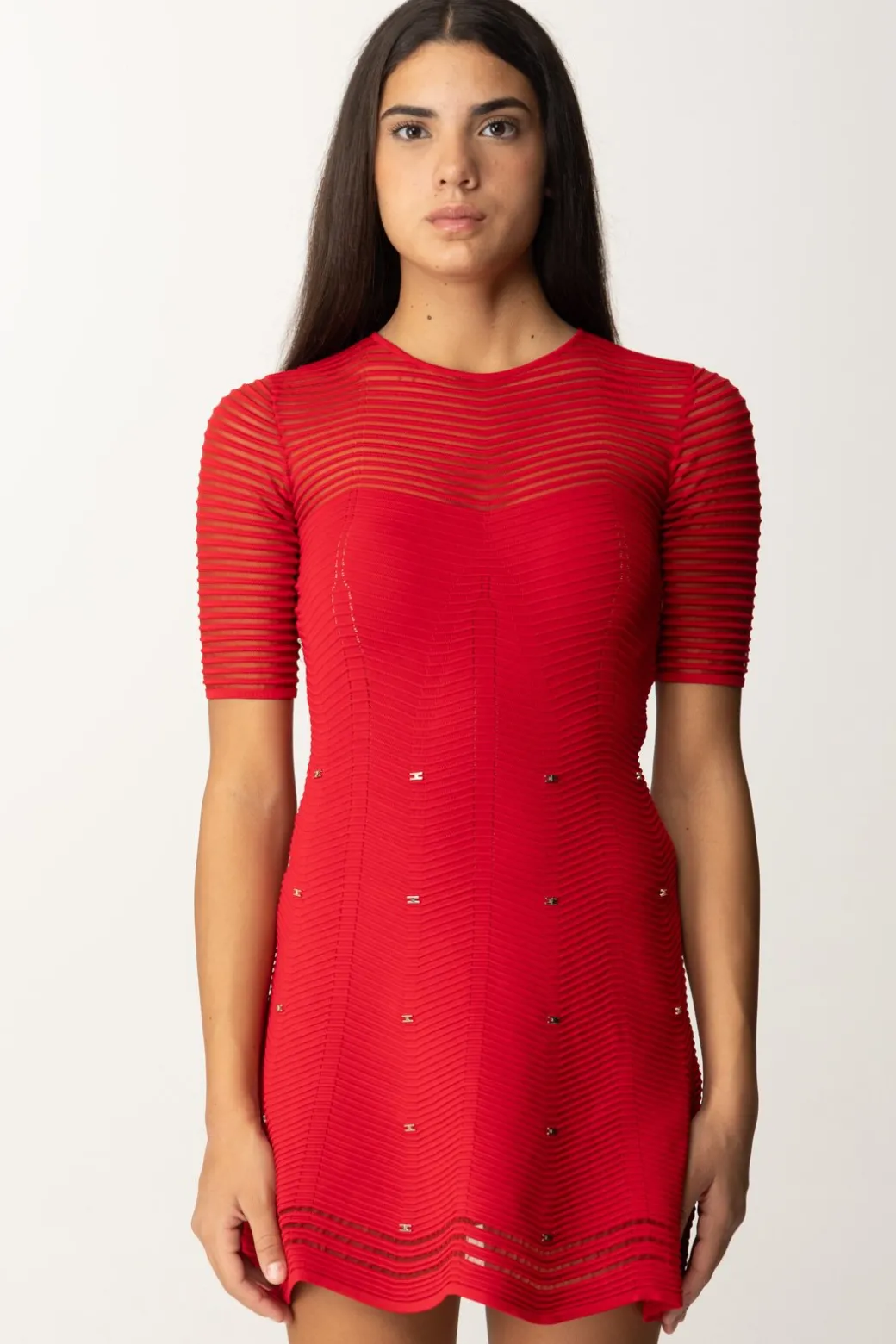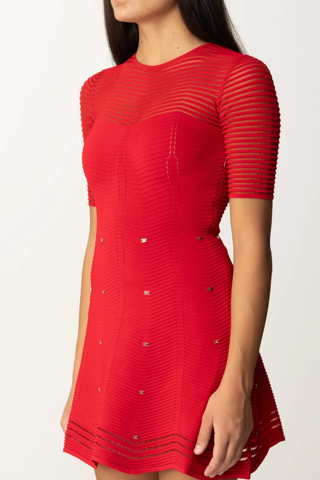 Un mini abito Elisabetta Franchi giocoso e femminile, perfetto per una serata fuori o un evento casual chic. Realizzato in viscosa motivo chevron tridimensionale che si altern a un punto rete. Lo scollo a giro, le maniche trasparenti e la gonna svasata impreziosita da mini loghi gold, sono i dettagli chic che rendono questo abito un must-have di ogni guardaroba.