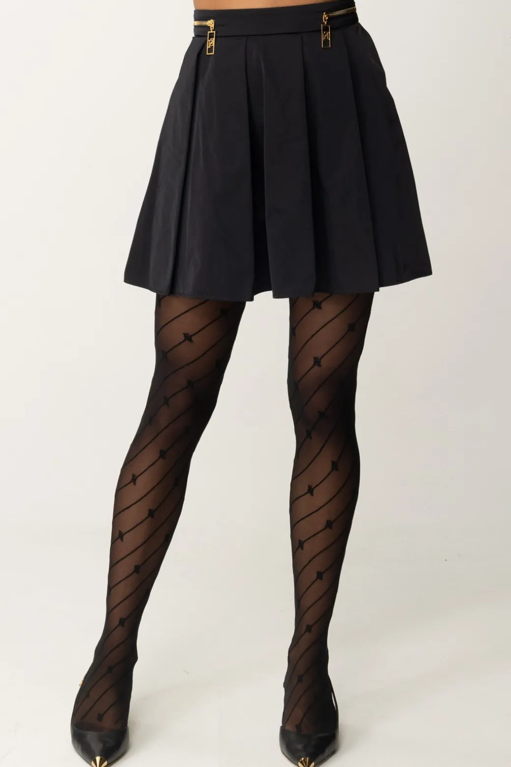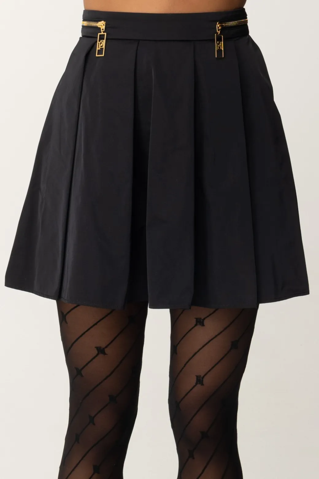 Un po’ vintage, un po’ preppy: questa minigonna Elisabetta Franchi, a pieghe riprende quel capo che non se ne va mai del tutto dal guardaroba, e lo rende attuale con un tocco ispirato ai leit motiv della collezione, ovvero la zip dorata ai fianchi con maxi tiretto. Un capo versatile e femminile, teen nell’anima ma da declinare in tantissimi modi, inclusi i più eleganti.