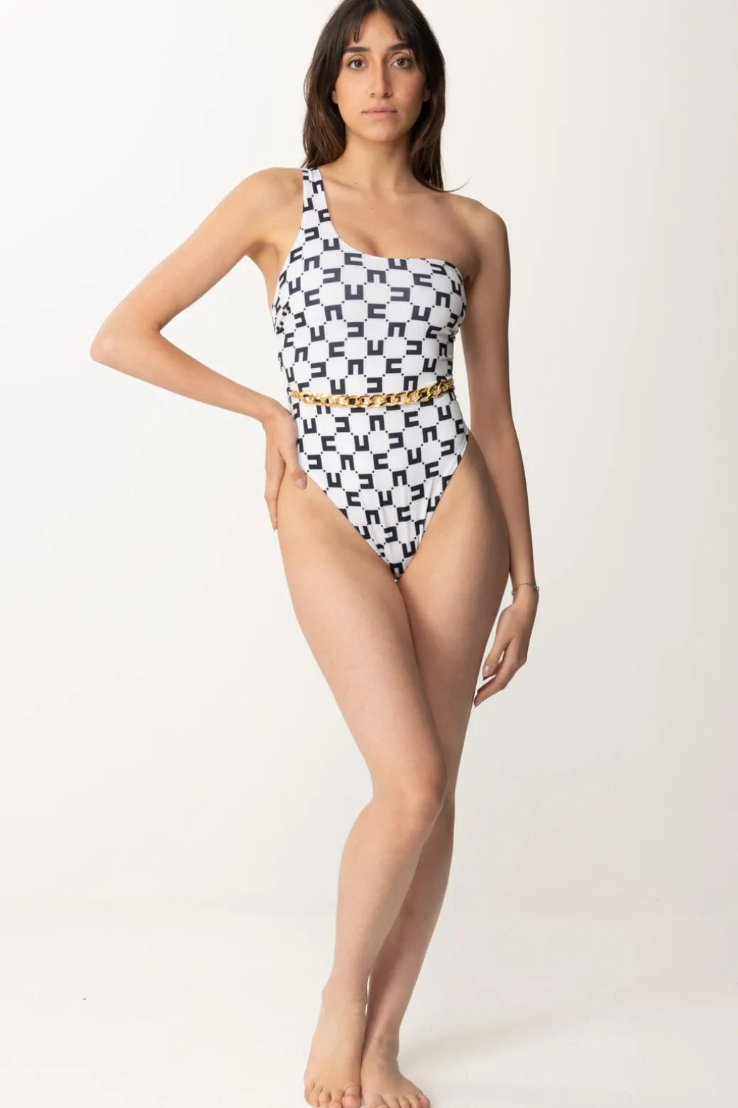 Se sei una EF lover, questo è sicuramente il costume più iconico che potrai indossare questa stagione: la stampa logo cubico si combina con il leit motiv dell’accessorio catena al punto vita e all’asimmetria del top monospalla. Un monokini Elisabetta Franchi che farà fare level up alle tue giornate in spiaggia, in termini di stile e femminilità.