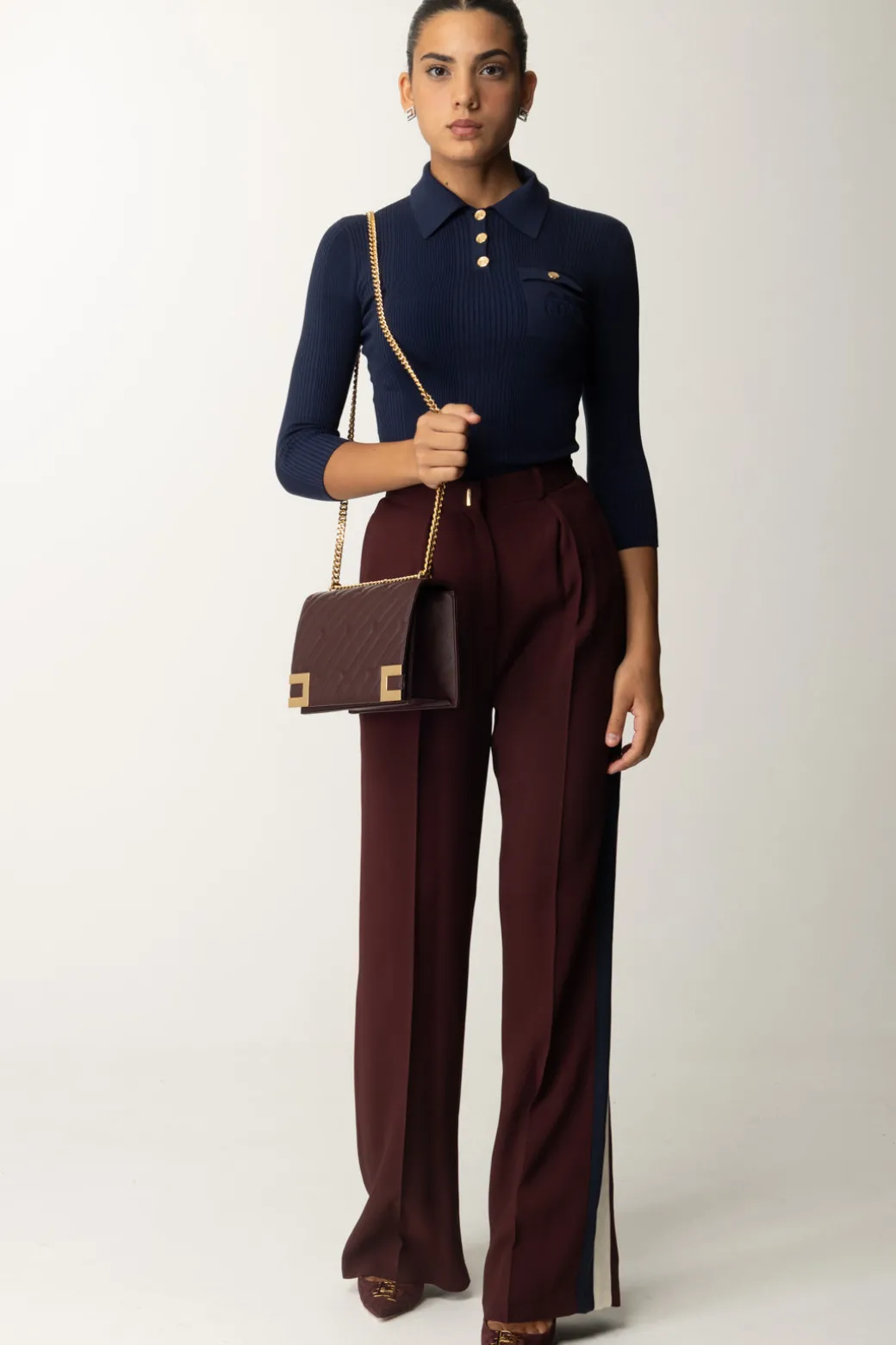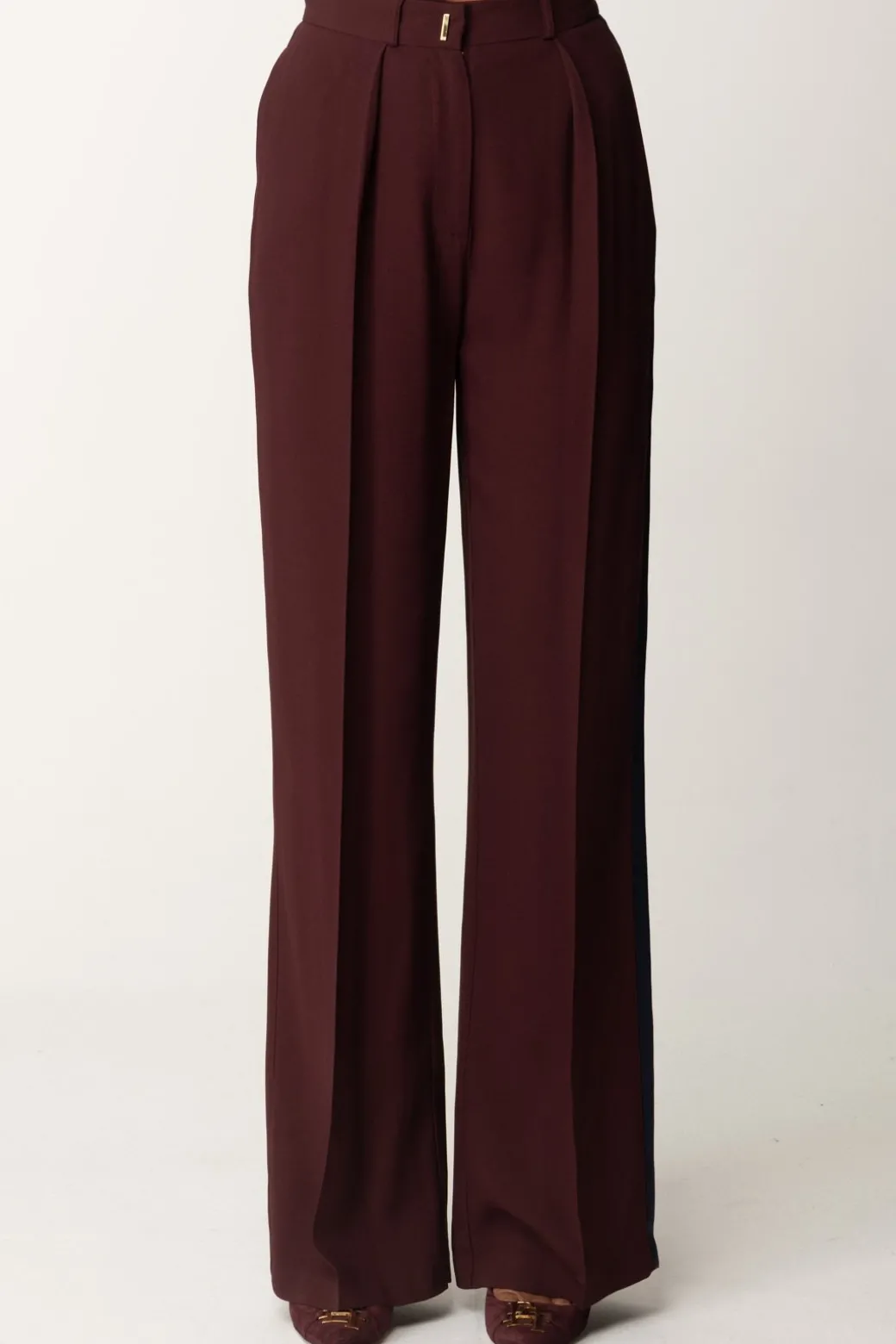 Eleganza moderna è ciò che emanano questi pantaloni Elisabetta Franchi , hanno un taglio dritto, sono realizati in crêpe enver satin e caratterizzati con pinces e bande laterali a contrasto di colore. Ideale per un look raffinato e contemporaneo.