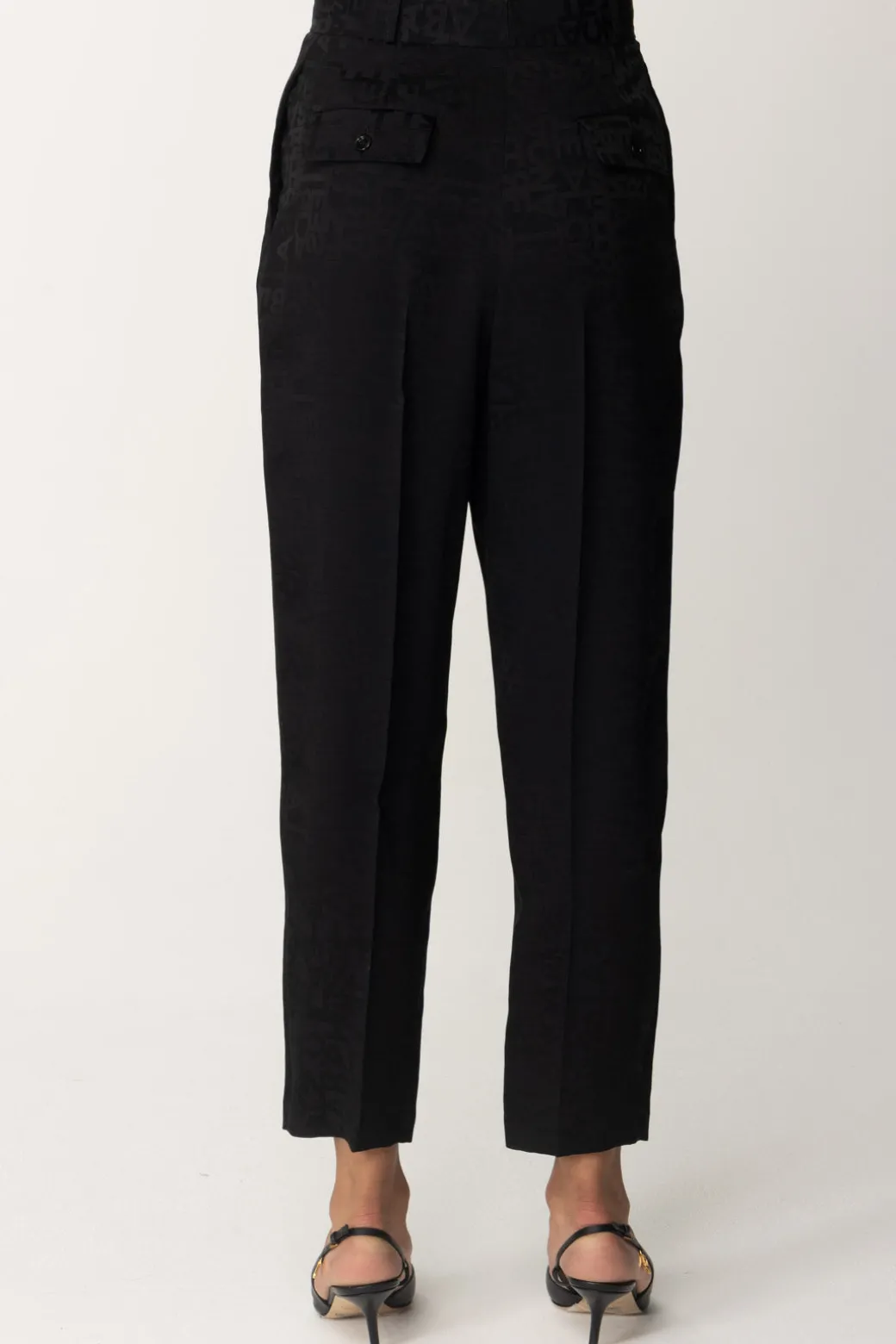 Eleganza urbana caratterizza questi pantaloni Elisabetta Franchi dal taglio dritto e realizzati in crêpe jacquard con una stampa lettering. Il fascione in vita e le doppie pinces anteriori donano una silhouette raffinata.