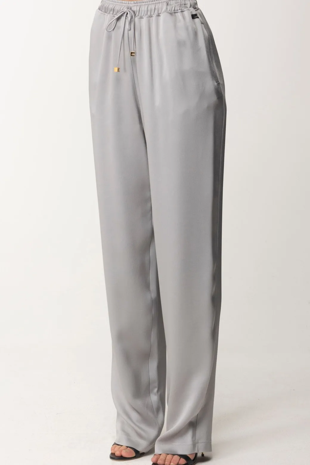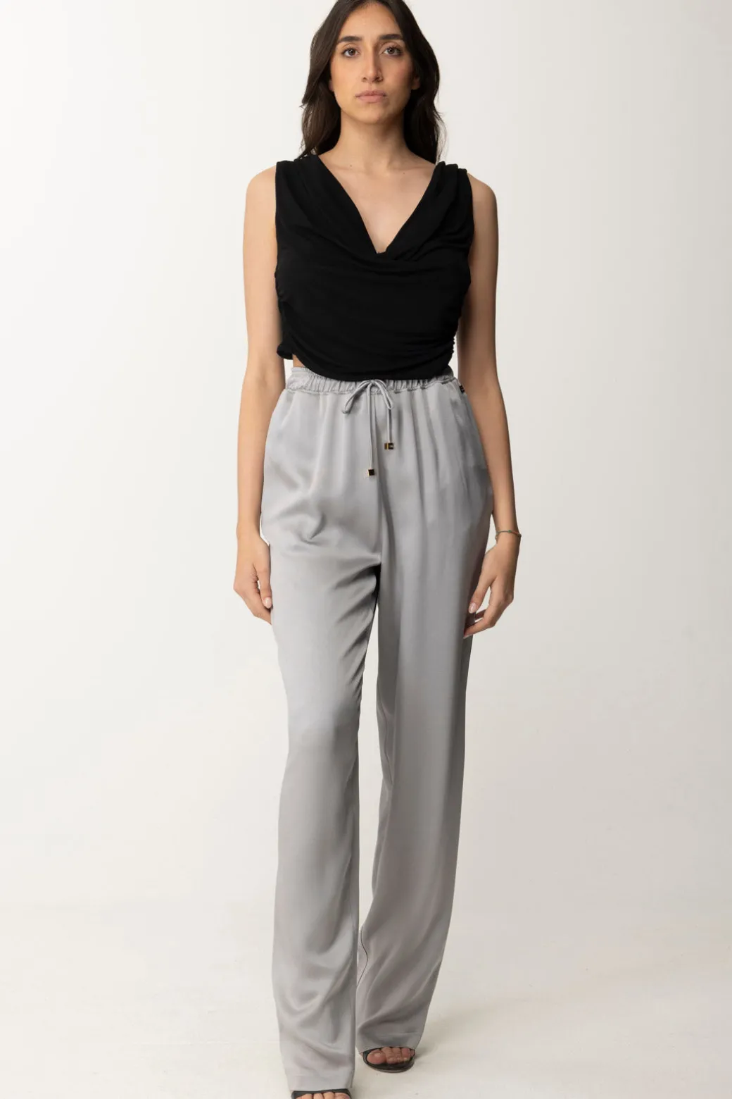 Questi eleganti pantaloni jogger di Elisabetta Franchi sono l’epitome della comodità chic. Realizzati in morbido crêpe, vantano una silhouette rilassata in raso che li rende perfetti sia per un look da ufficio che per un aperitivo serale. Il design pulito è arricchito da dettagli raffinati, come l’elastico in vita che assicura una vestibilità impeccabile e un piccolo charm dorato che aggiunge un tocco di lusso discreto.
