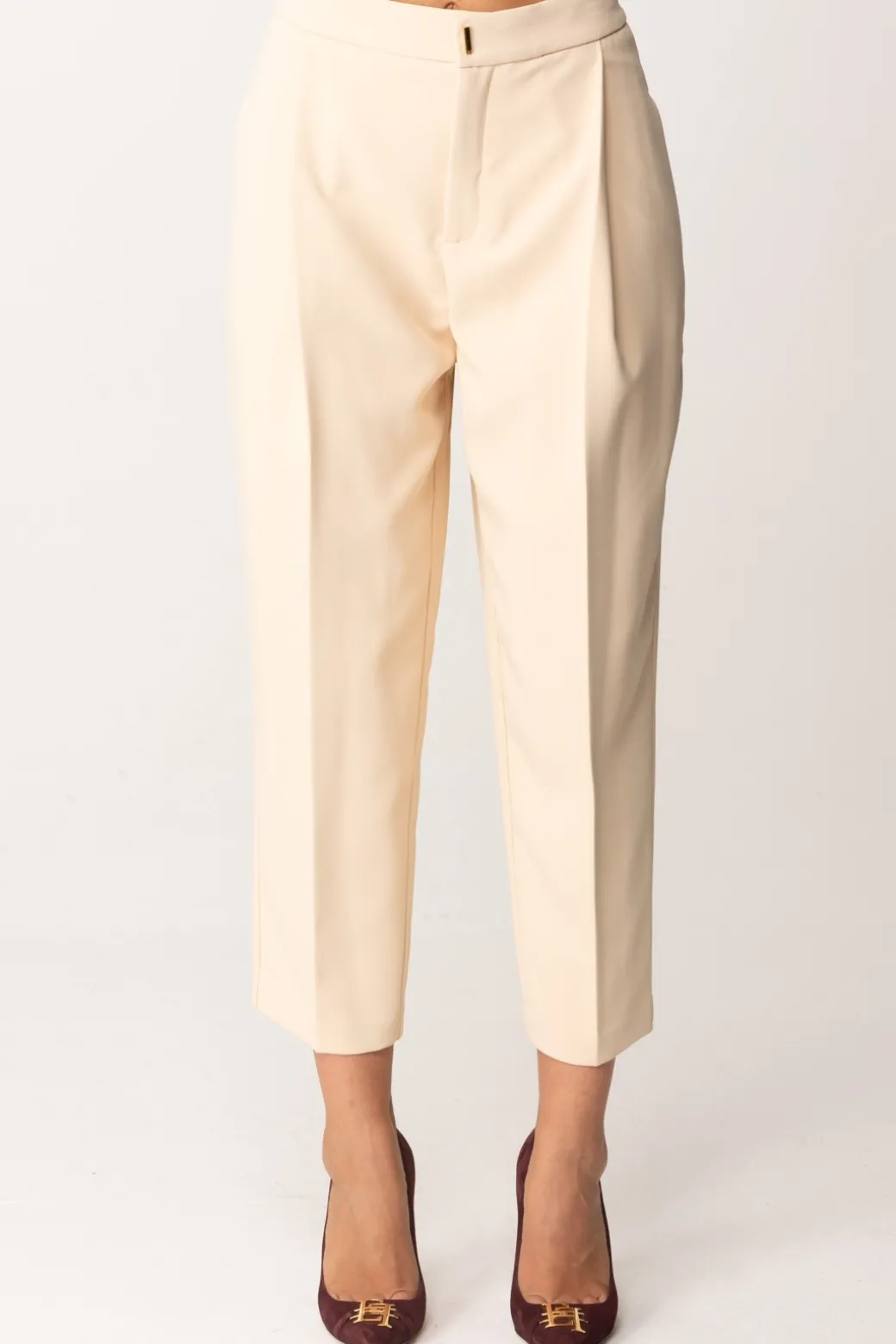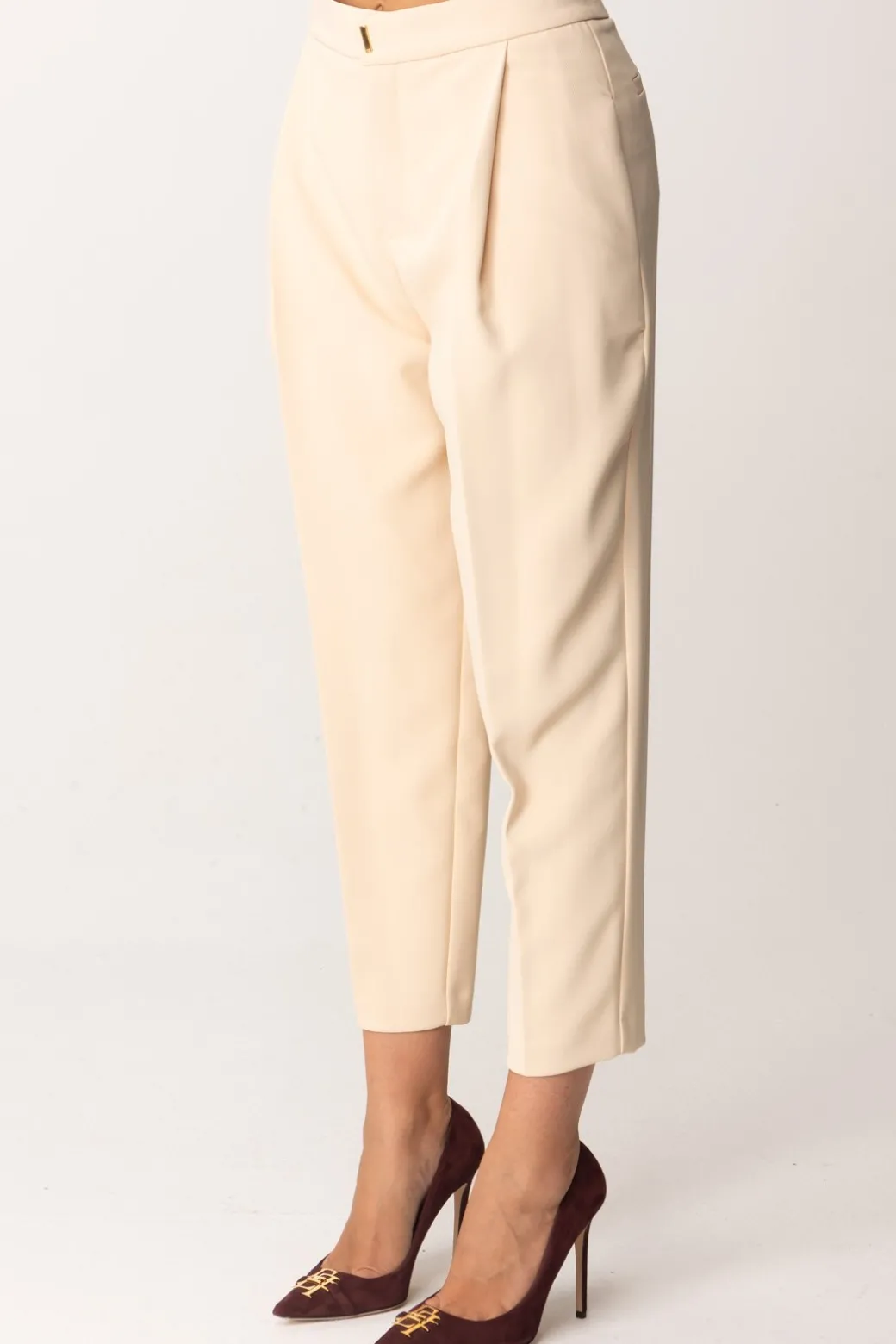 Pantaloni Elisabetta Franchi che rendono super attuale la loro eleganza connaturata, realizzati in crepe stretch con pinces frontali e stiro piega. A renderli attuali è il taglio crop: un espediente che ti farà sbizzarrire nei tuoi abbinamenti: rendili casual con un anficio o un tronchetto, o super chic con tacchi e slingback.