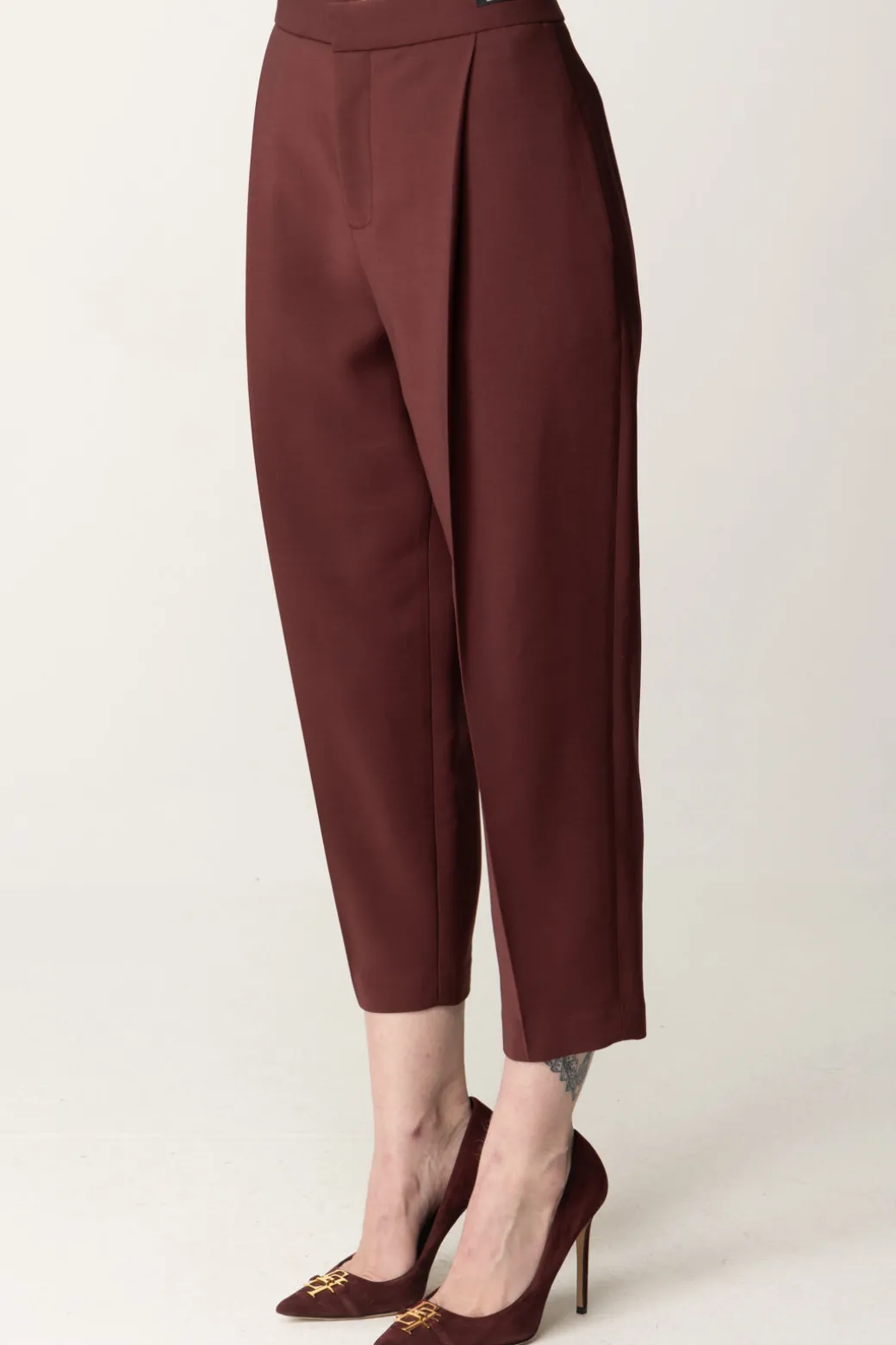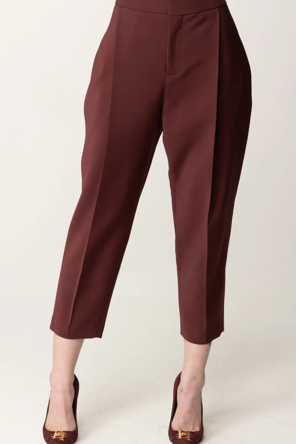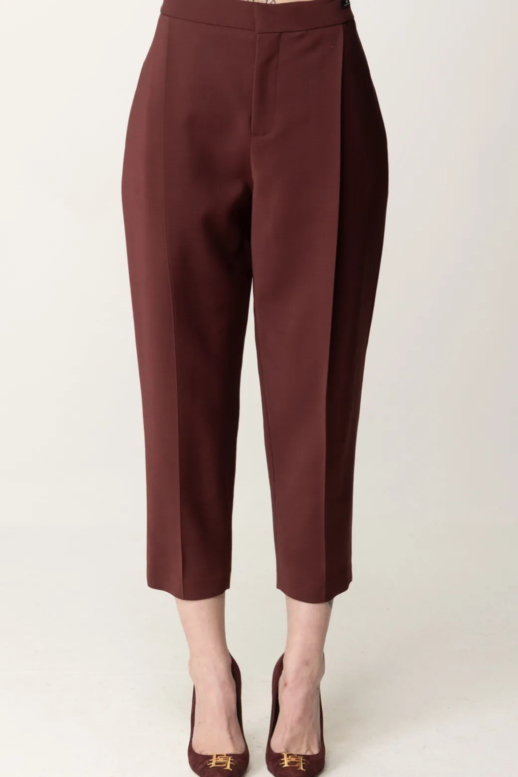 Un classico reso moderno dal taglio crop: questi pantaloni Elisabetta Franchi si faranno amare per la loro unicità! Modello elegante con stiro piega, realizzato in fresco lana, la gamba crop li rende subito più sfiziosi, prestandoli ad abbinamenti originali con sneakers, anfibi e tronchetti per esisti carefree, tanto quanto a bluse e decolletes.