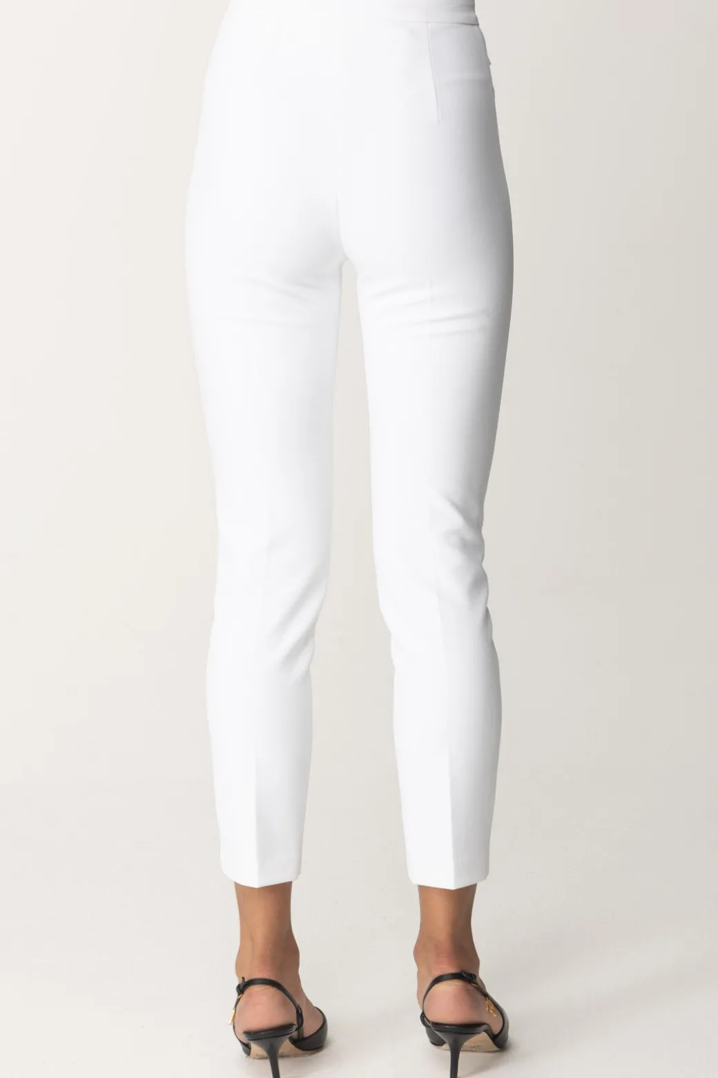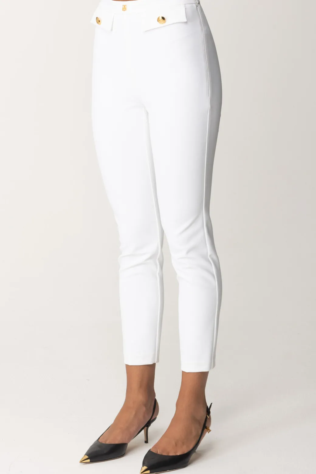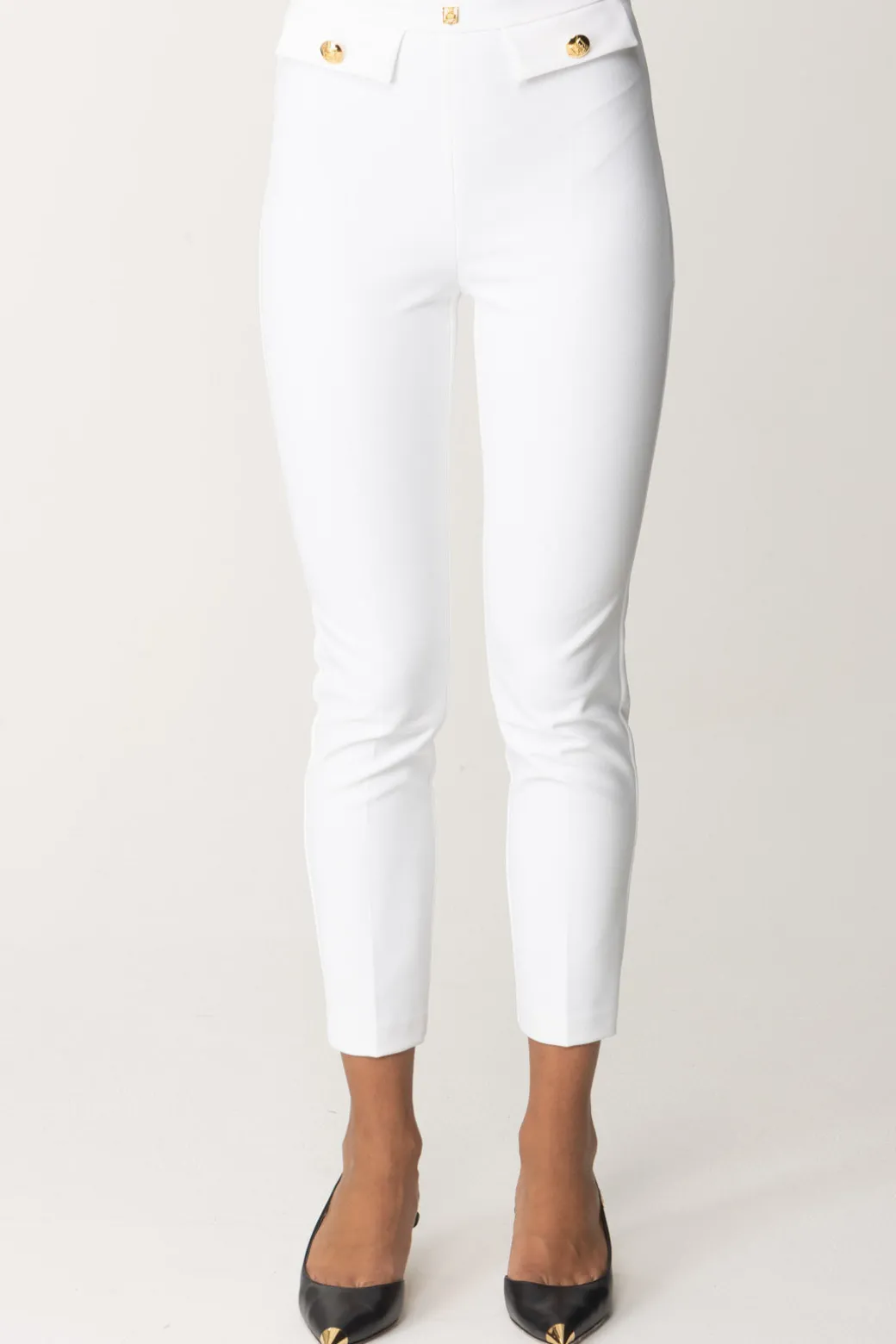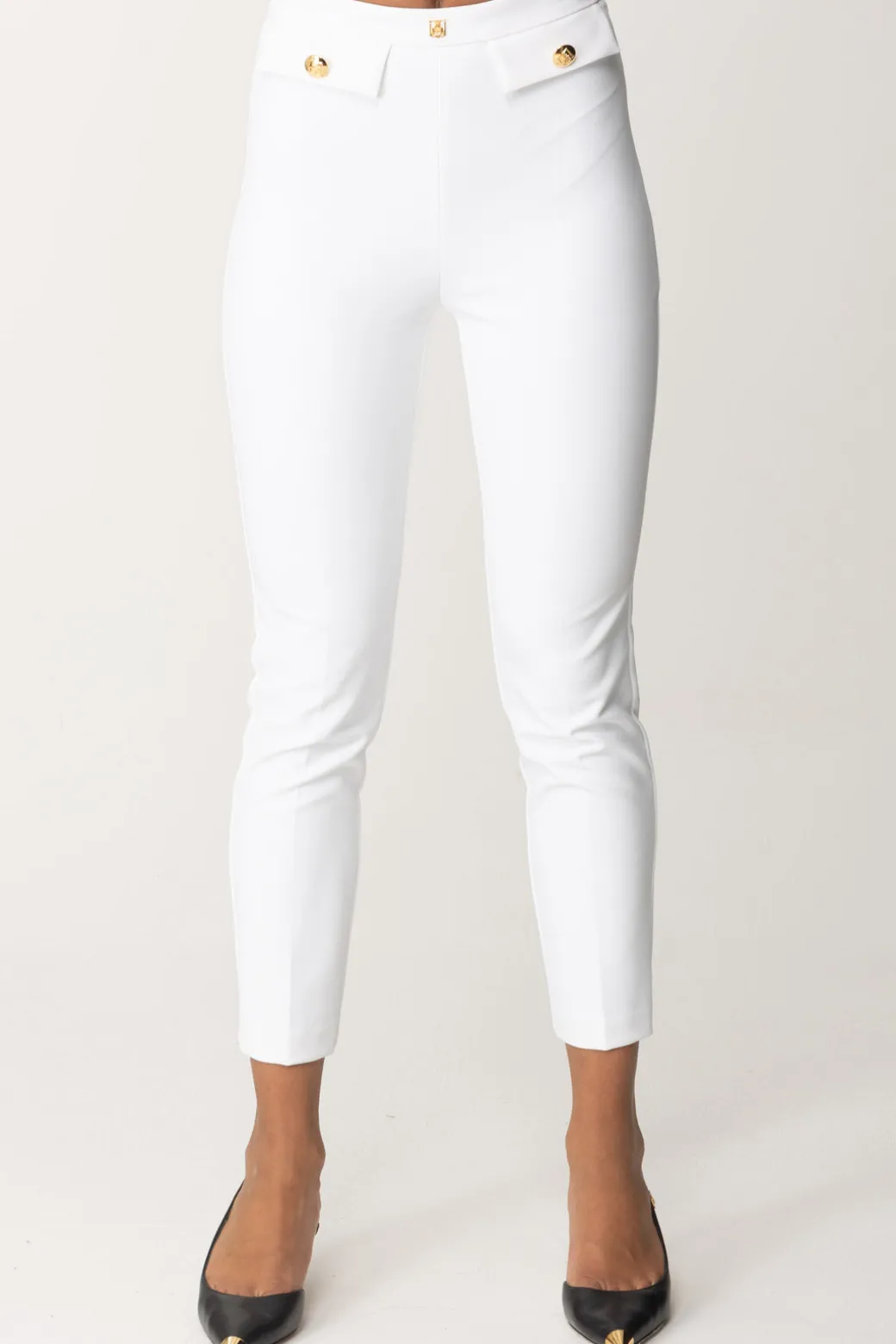 Dalla mattina alla sera, qualsiasi momento è quello giusto per indossare dei pantaloni Elisabetta Franchi come questi. A pieno titolo tra gli essentials del tuo guardaroba, la loro versatilità li rende adatti a t-shirt e snekaers quanto a giacca e tacco alto. Versatili sì, ma anche accurati: lo confermano il logo sul fascione in vita e le pattine con bottone oro logato ai fianchi.