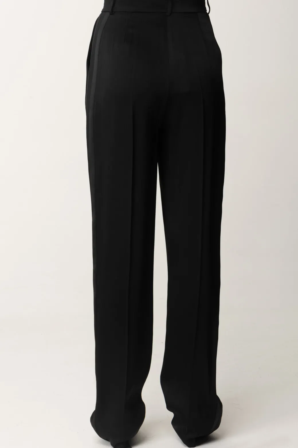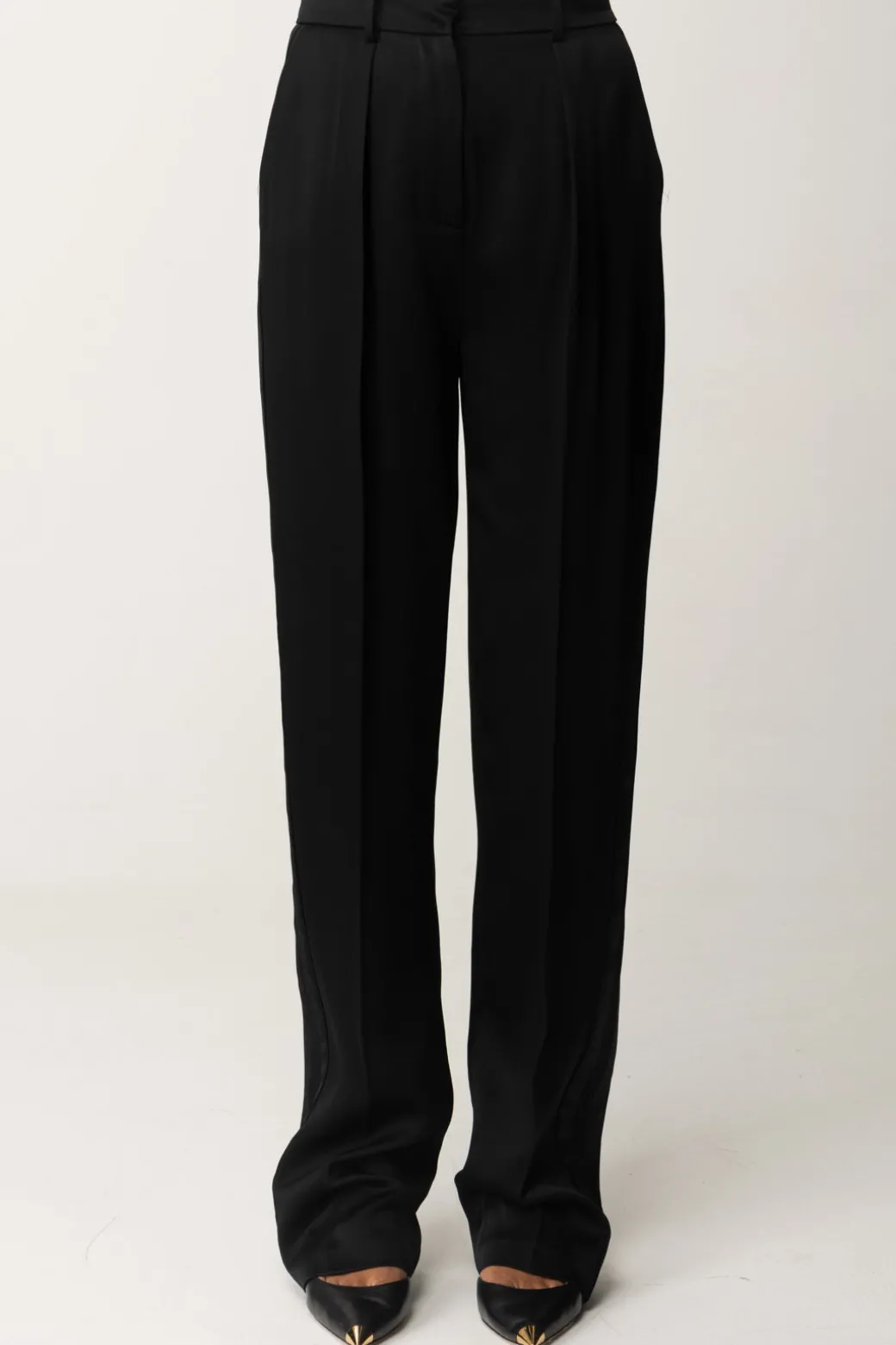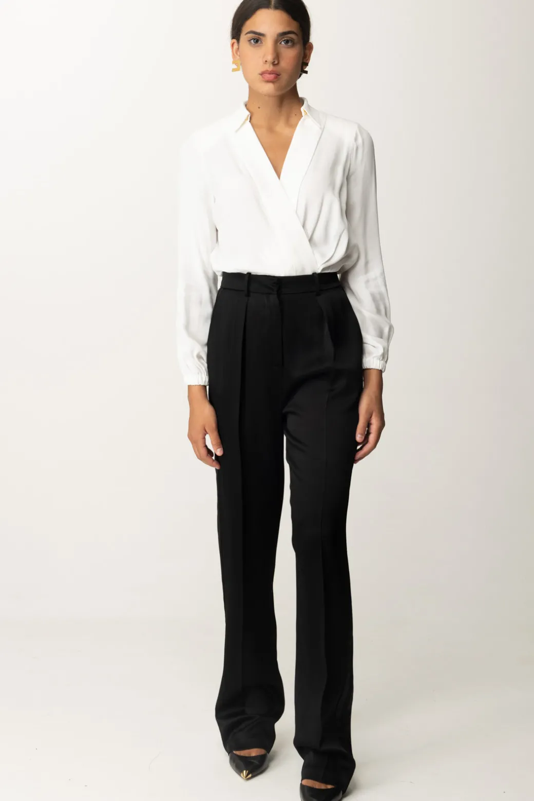 Pantaloni Elisabetta Franchi taglio dritto, realizzati in enver satin lucido e caratterizzati da pinces frontali che ne sottolineano l’eleganza e il design classico, perfetti per i tuoi look più formali e chic. Ma se provassi ad abbinarli ad una t-shirt stampata e delle sneakers? Avrai ottenuto un outfit originale, una commistione di mood da vera fashionista.