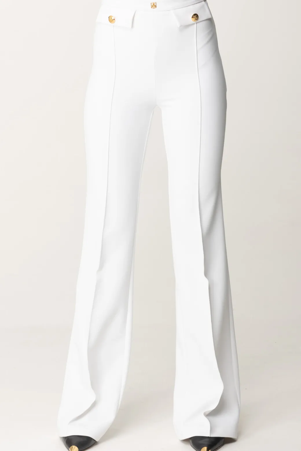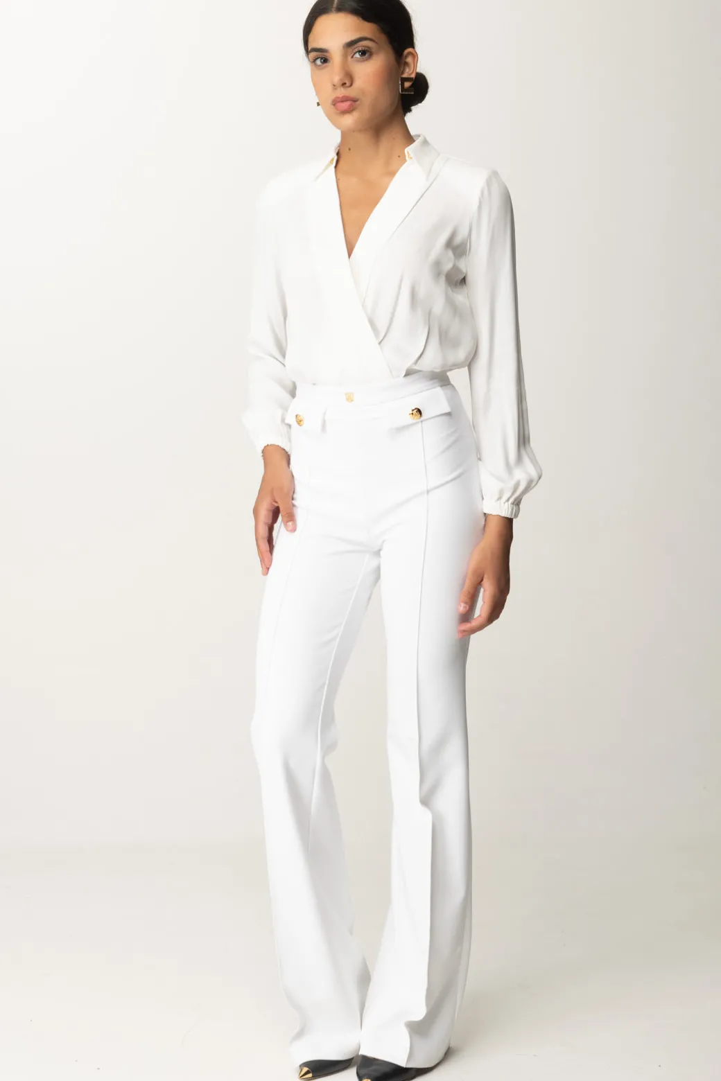 Classici, e per questo eleganti in ogni aspetto: questi pantaloni Elisabetta Franchi con taglio a palazzo sono una garanzia per i tuoi look formali, a cui daranno quel tocco di monumentalità e ricercatezza. Patte al punto vita e rivetto con logo, perfetti con body camicia e top crop bustier.
