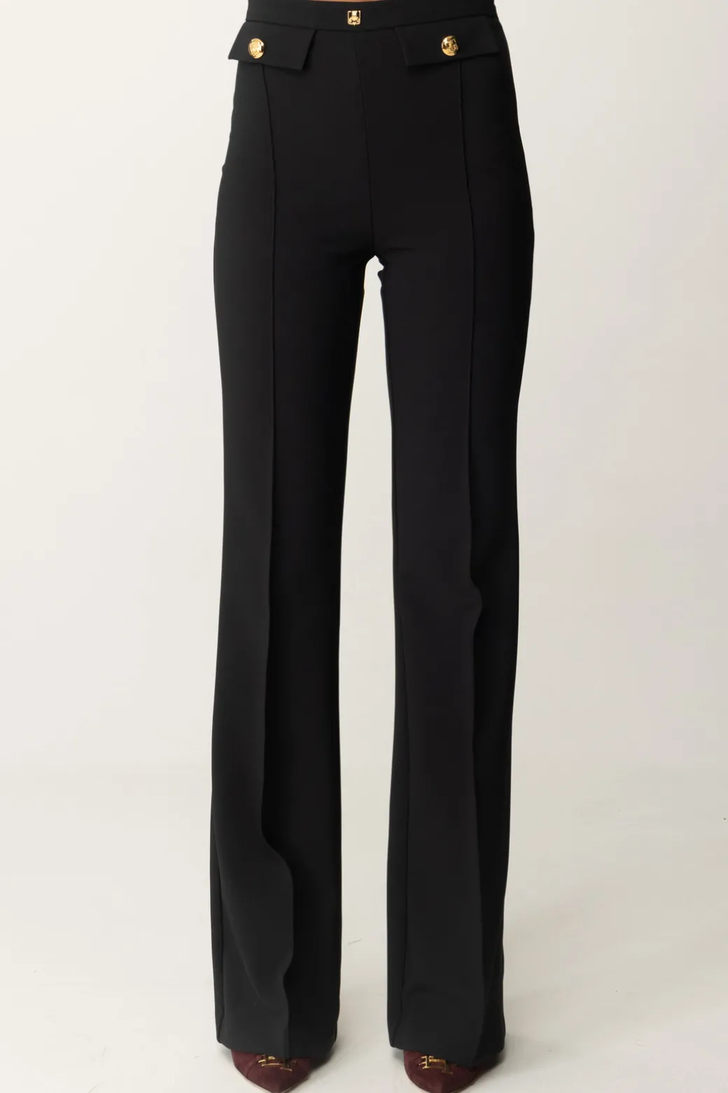Classici, e per questo eleganti in ogni aspetto: questi pantaloni Elisabetta Franchi con taglio a palazzo sono una garanzia per i tuoi look formali, a cui daranno quel tocco di monumentalità e ricercatezza. Patte al punto vita e rivetto con logo, perfetti con body camicia e top crop bustier.
