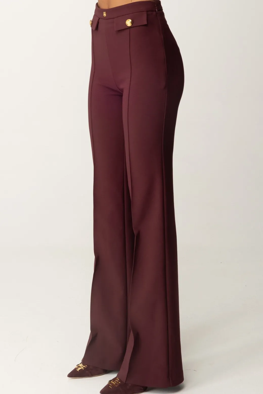 Classici, e per questo eleganti in ogni aspetto: questi pantaloni Elisabetta Franchi con taglio a palazzo sono una garanzia per i tuoi look formali, a cui daranno quel tocco di monumentalità e ricercatezza. Patte al punto vita e rivetto con logo, perfetti con body camicia e top crop bustier.