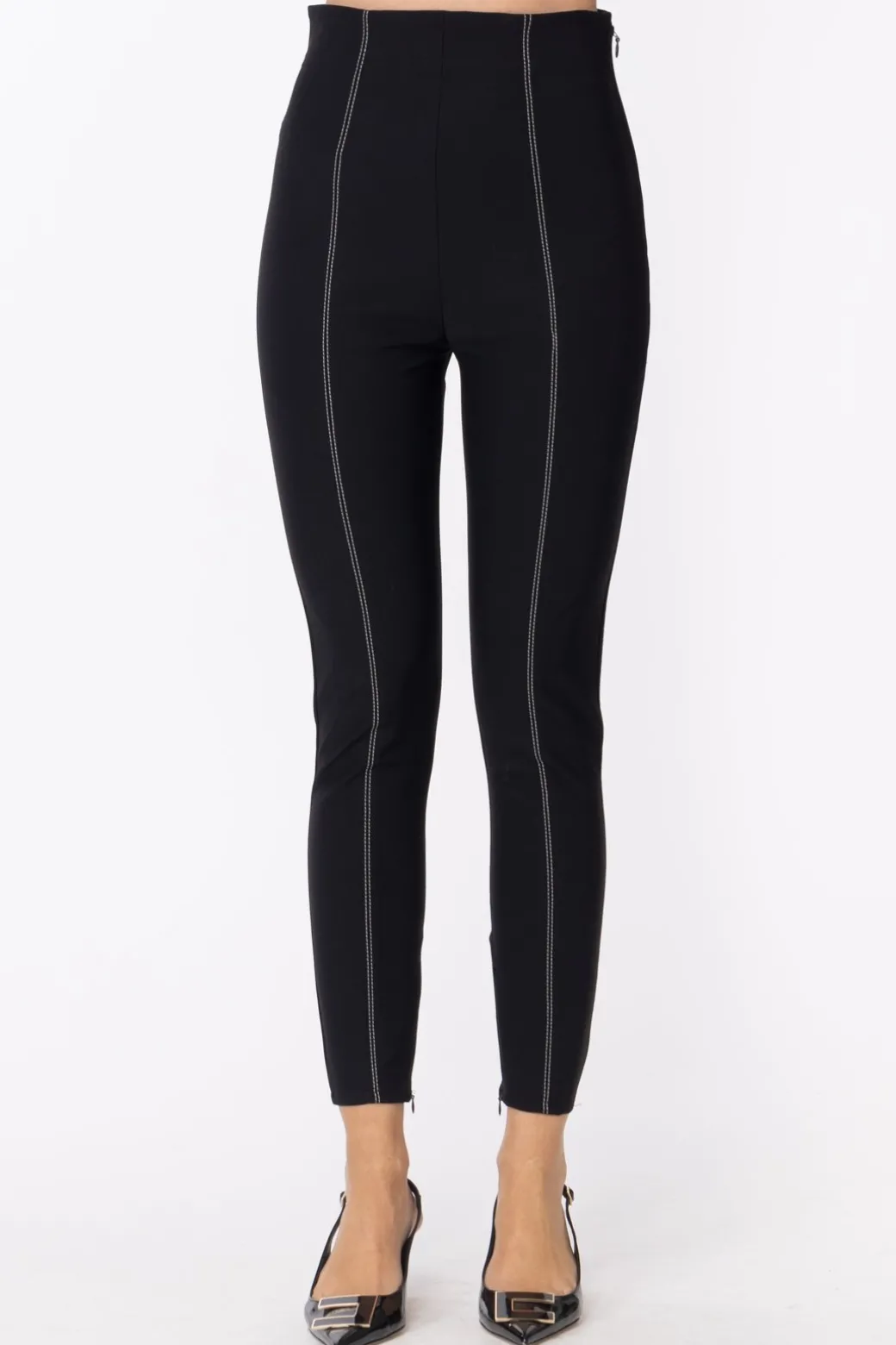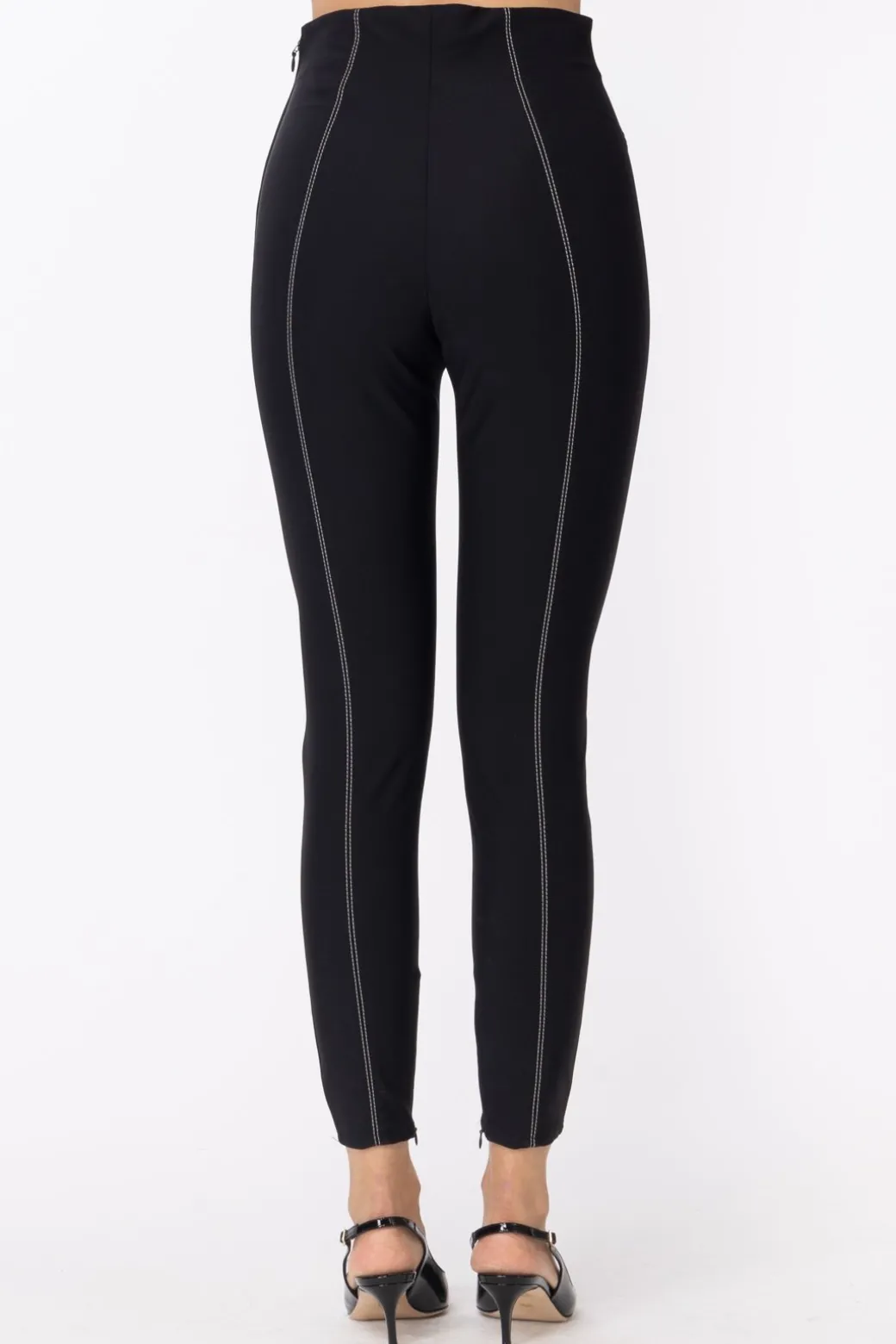 Pantaloni Elisabetta Franchi dalla vestibilità super aderente, con un punto vita molto alto per esaltare la silhouette. Caratterizzati da tagli lungo il centro delle gambe, impunture in contrasto di colore e da una cintura in vernice per un aspetto più audace.