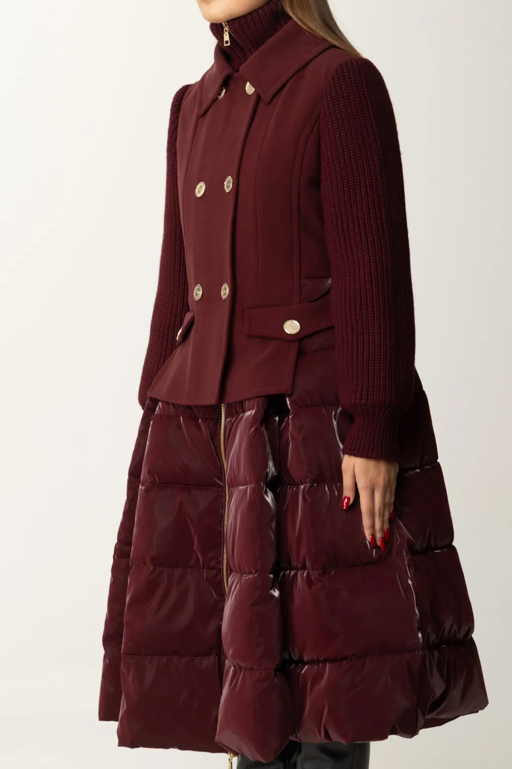 Questo piumino Elisabetta Franchi conquisterà ogni sguardo! Il suo design moderno e femminile è caratterizzato da un contrasto di tessuti, la parte superiore è realizzata in panno con maniche a coste, mentre l’ampia gonna a ruota è realizzata in nylon lucido. La silhouette stretta in vita lo rende femminile ed elegante, perfetto per chi cerca eleganza senza rinunciare alla praticità di un buon capospalla caldo.