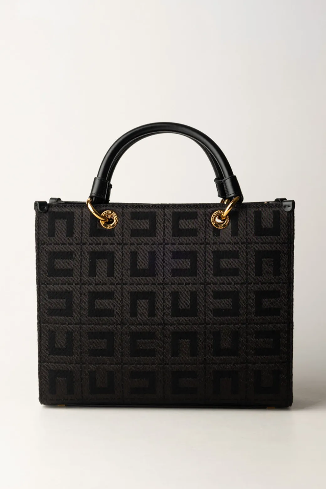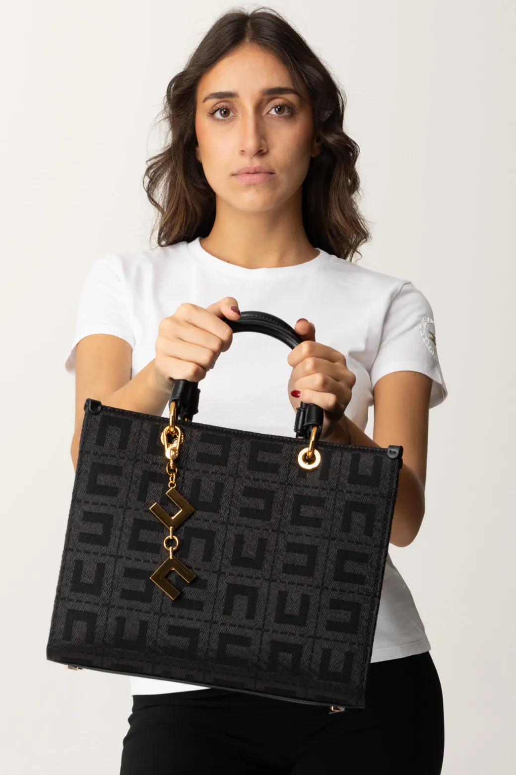 Questa shopper grande Elisabetta Franchi è il mix perfetto tra eleganza e praticità. Le sue linee strutturate la rendono ideale per l’ufficio, ma i dettagli come gli charm logati in tono e il tessuto jacquard la rendono adatta anche per un aperitivo post-lavoro. Abbinala a un tailleur o a un trench classico per un look da vera business woman.