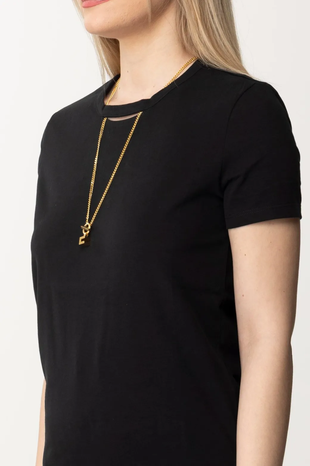 Semplice e al tempo stesso fantasiosa questa t-shirt Elisabetta Franchi, che sfrutta la presenza del cut-out al colletto per inserire una collana logata che impreziosisce con garbo anche il tuo look più casual. Perfetta con tutti i bottom della collezione, oltre che come sottogiacca: scegli solo il colore che più si addice al tuo mood di stagione.