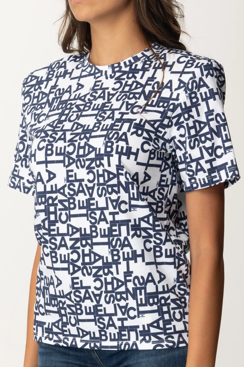 T-shirt Elisabetta Franchi basica, caratterizzata dal logo lettering del brand utilizzato come pattern a contrasto di colore, per un risultato stiloso e ipnotico. Spalline imbottite per un tocco retrò, ma non solo: sarà l’espediente perfetto per creare ancora più equilibrio lungo la silhouette, specialmente se abbini questa t-shirt a bottom a vita alta che diano enfasi ai fianchi.