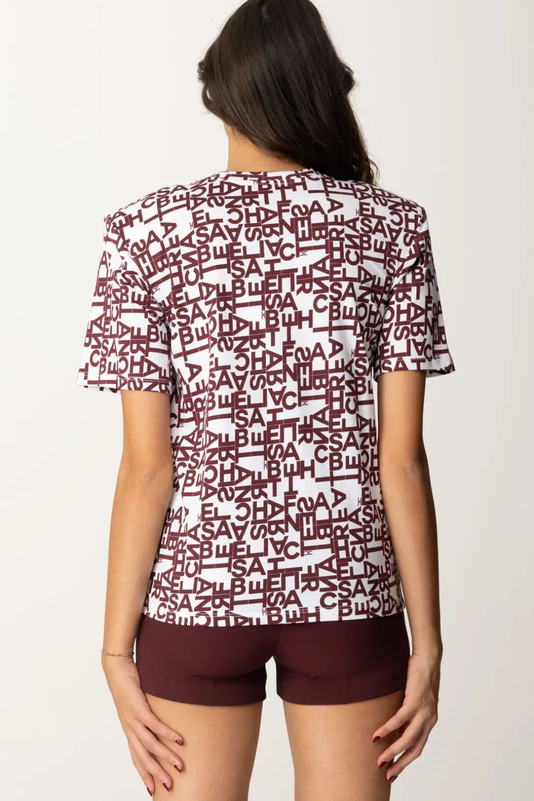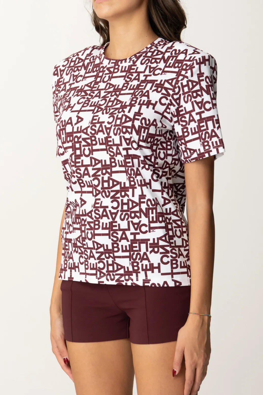 T-shirt Elisabetta Franchi basica, caratterizzata dal logo lettering del brand utilizzato come pattern a contrasto di colore, per un risultato stiloso e ipnotico. Spalline imbottite per un tocco retrò, ma non solo: sarà l’espediente perfetto per creare ancora più equilibrio lungo la silhouette, specialmente se abbini questa t-shirt a bottom a vita alta che diano enfasi ai fianchi.