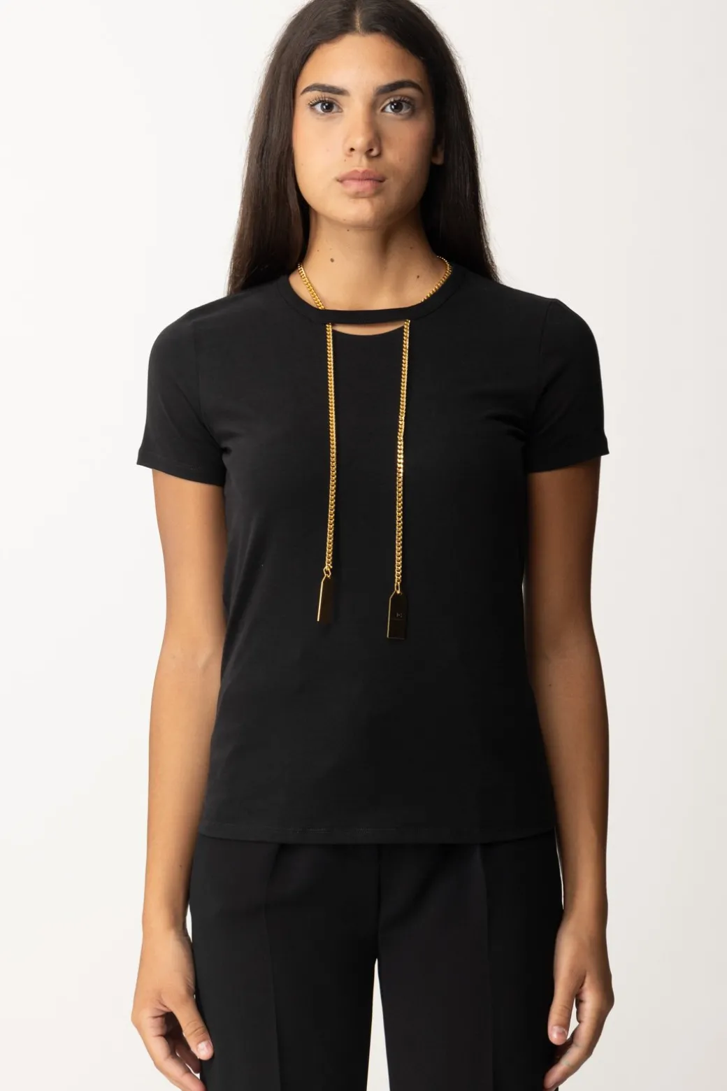 Cosa c’è di più bello di una t-shirt Elisabetta Franchi di tendenza? Una t-shirt Elisabetta Franchi completa di gioiello! In questo caso, di una bella collana con pendenti logati, che illumina i tuoi outfit e li rende subito riconoscibili. ,Realizata in morbido jersey di cotone, manica corta e girocollo, un modello pratico e versatile, chic al punto giusto.