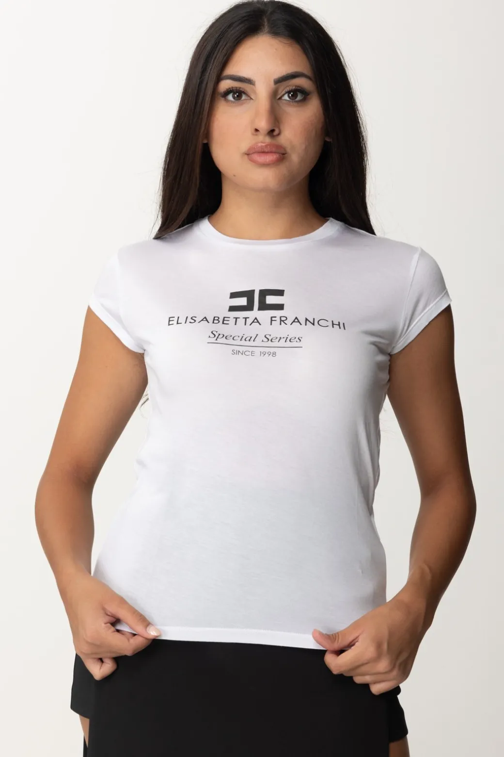 T-shirt Elisabetta Franchi in jersey modal con maniche ad aletta e stampa logo a contrasto. Un capo essenziale da indossare sotto una giacca di pelle per un look casual-chic.