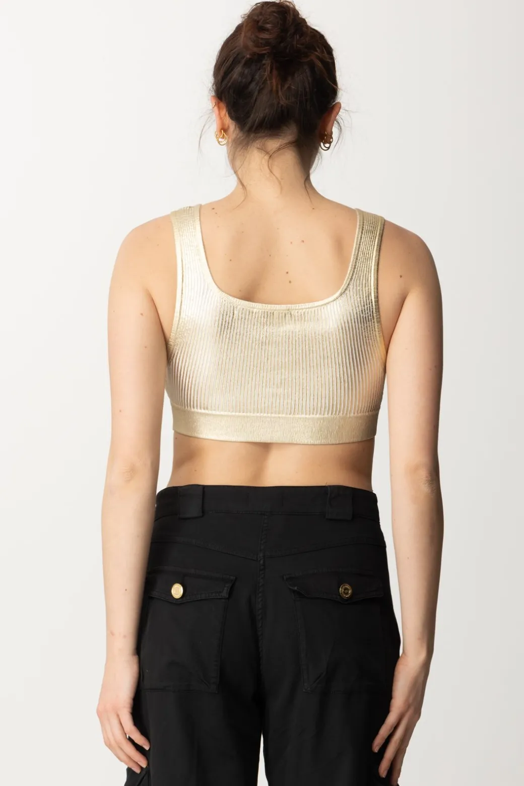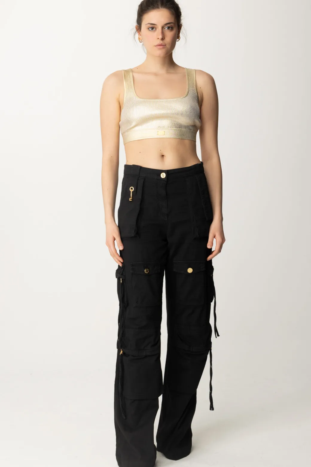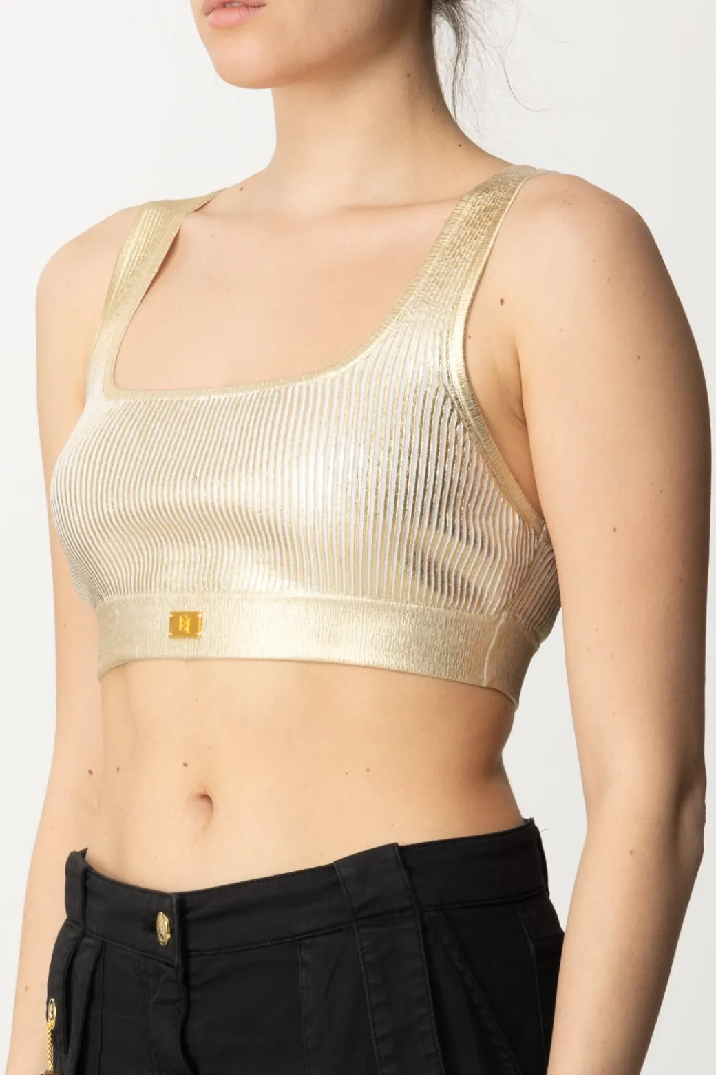 Top Elisabetta Franchi flashy ma versatile al tmepo stesso. Realizzato in viscosa effetto laminato, il taglio crop attenziona seno e punto vita, che potrai ulteriormente valorizzare con il giusto bottom. Perfetto per completare look casual-chic, con il suo tocco luminoso che spiccherà sotto giubbini in denim e cardigan all’occorrenza.