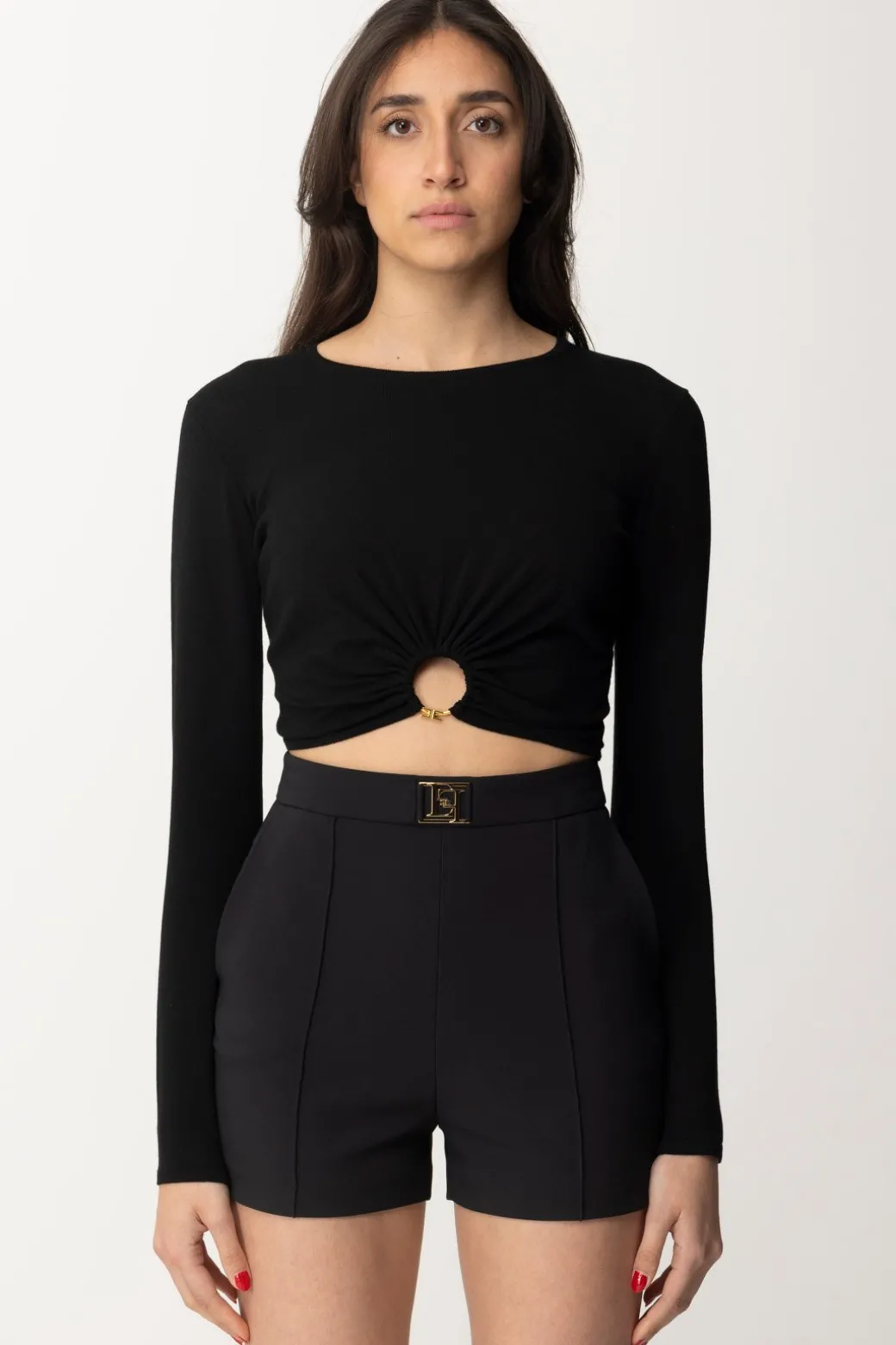 Un top Elisabetta Franchi dal taglio crop impreziosito da un accessorio gold anello posto al centro come tocco di luce. Un capo che unisce comfort e glamour.