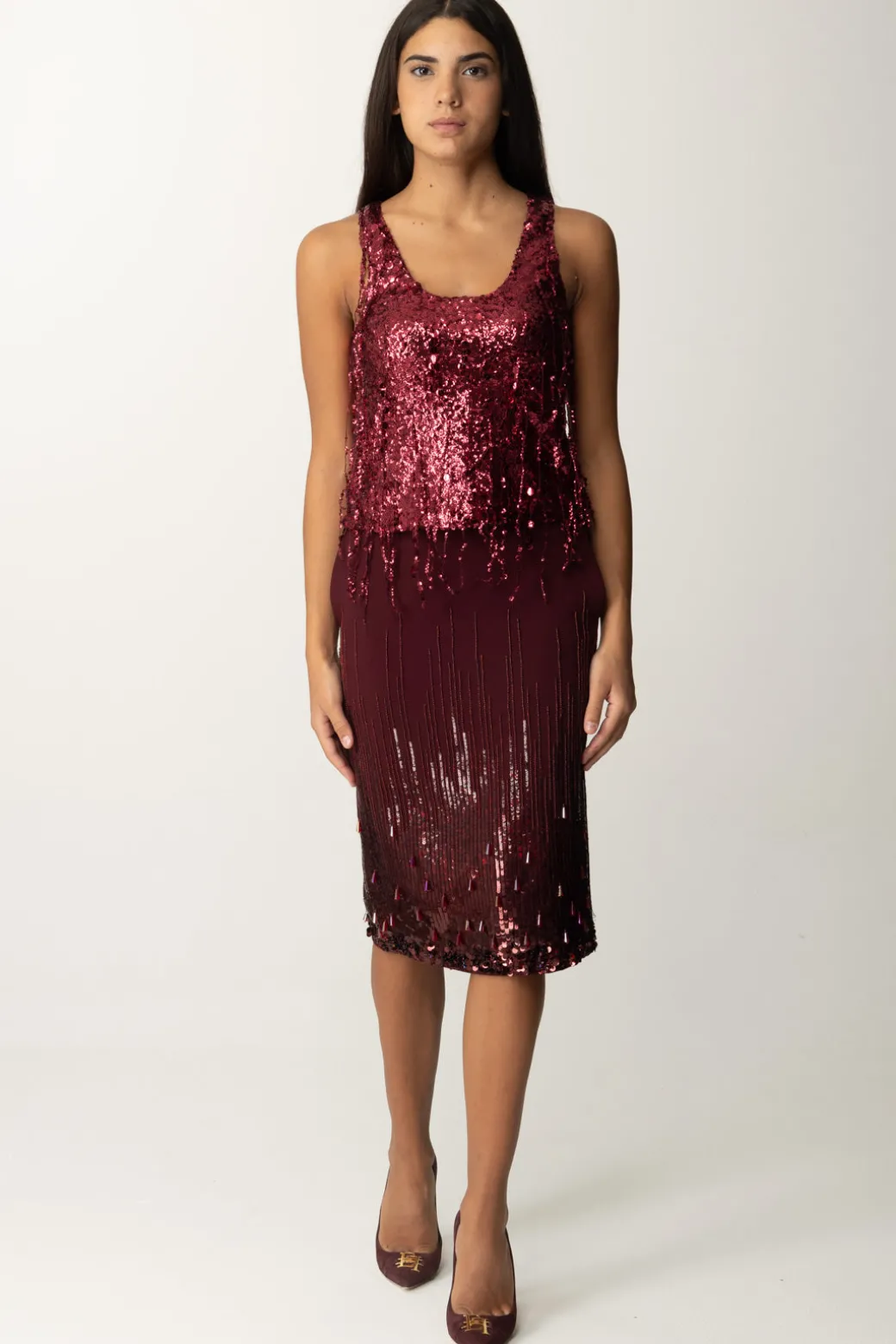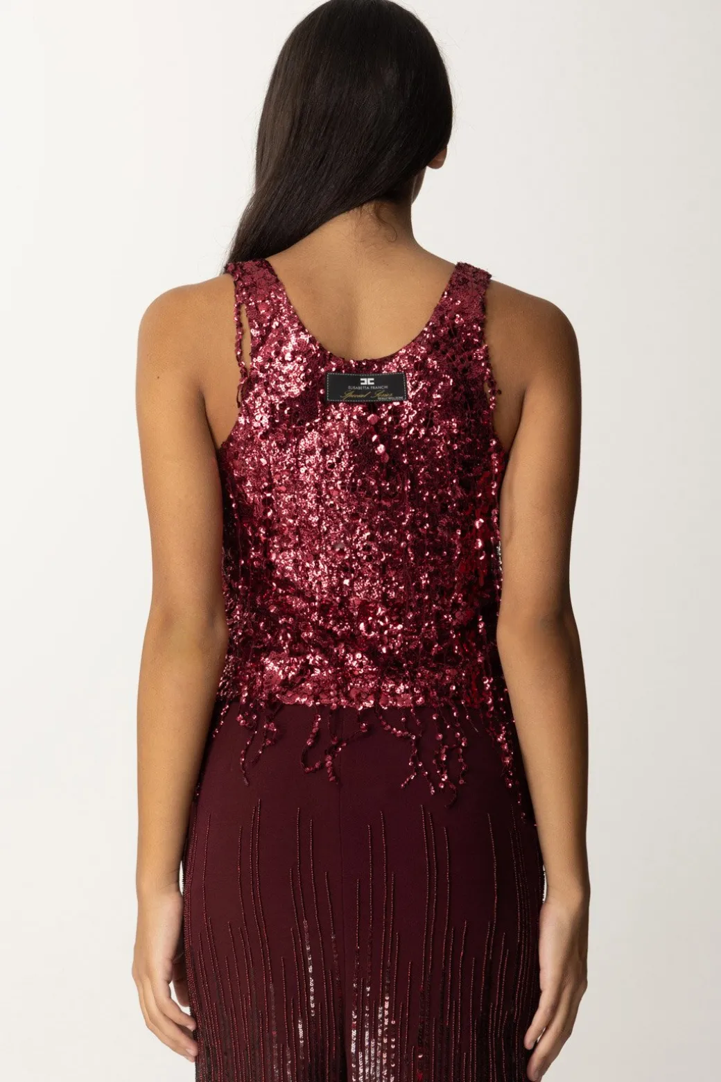 Questo top Elisabetta Franchi brilla di luce propria! Interamente ricamato con frange di paillettes che lo rendono perfetto per serate glamour. Abbinala a pantaloni aderenti o a una gonna a tubino per un look che cattura l’attenzione.