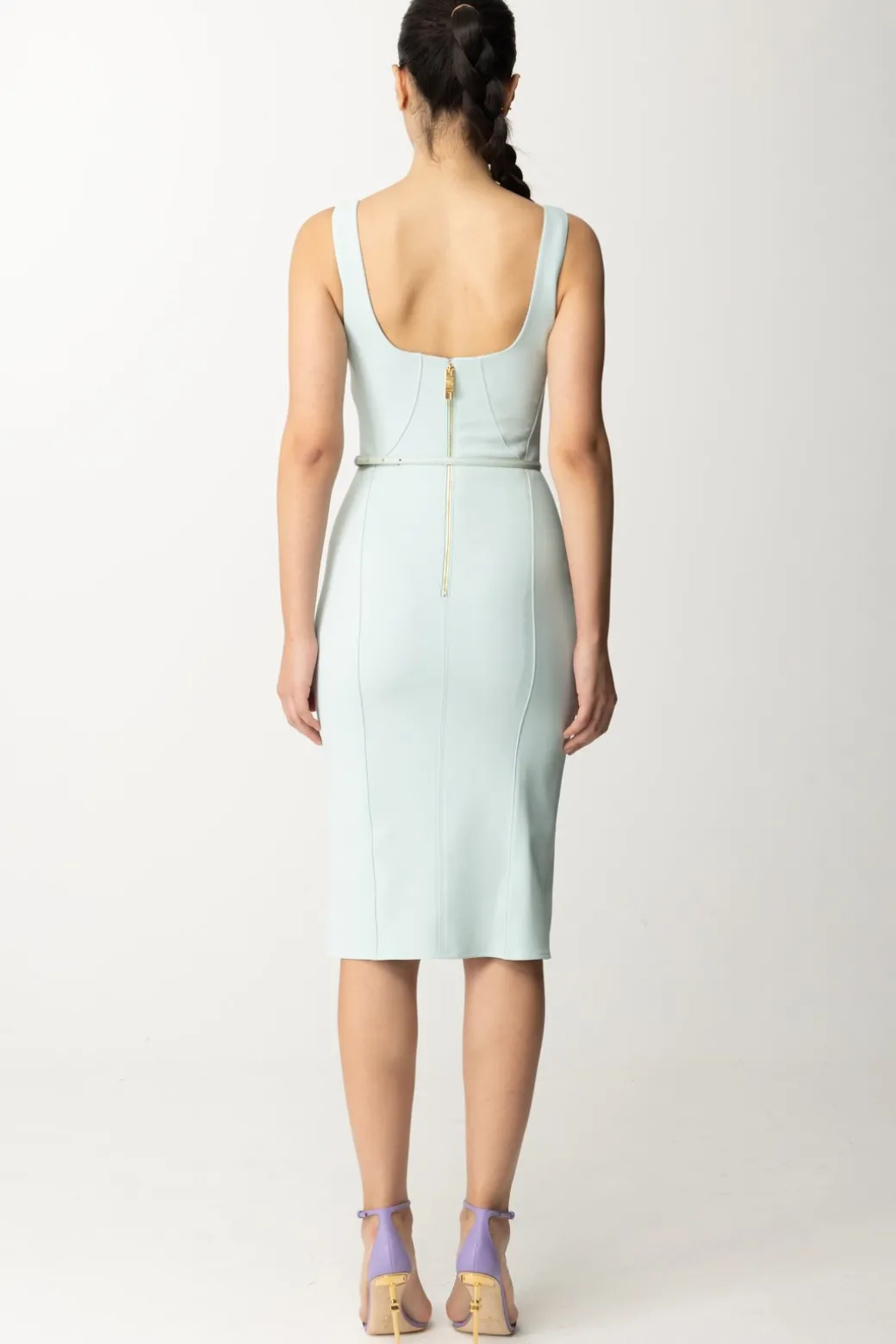 L’eleganza del tubino Elisabetta Franchi è evidente in questo abito in crêpe stretch con tagli che definiscono la silhouette. Il punto vita è accentuato da una cintura in tono, arricchita da un charm logo in metallo dorato. Un outfit sofisticato per chi ama sfoggiare uno stile impeccabile.