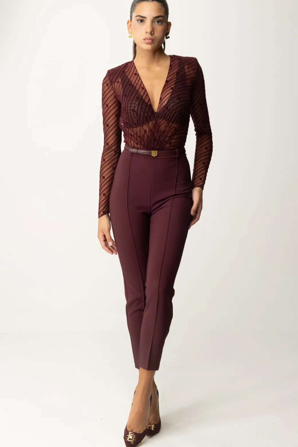 Questa tuta Elisabetta Franchi è composta da top staccabile e pantaloni slim. Il top è realizzato in tulle flock con un disegno diagonale, spalline imbottite e un sensuale scollo a V. Il pantalone evidenzia la silhouette con estremo fascino e illumina il punto vita con una cintura logata. Ideale per una serata speciale o un evento formale.