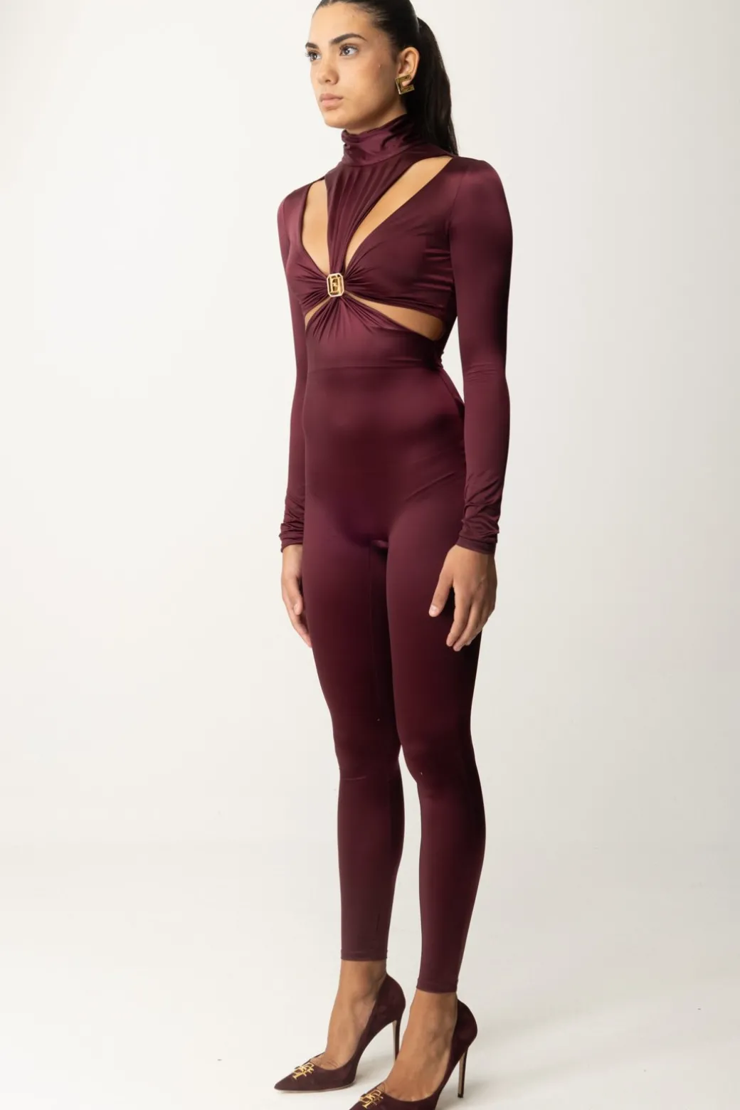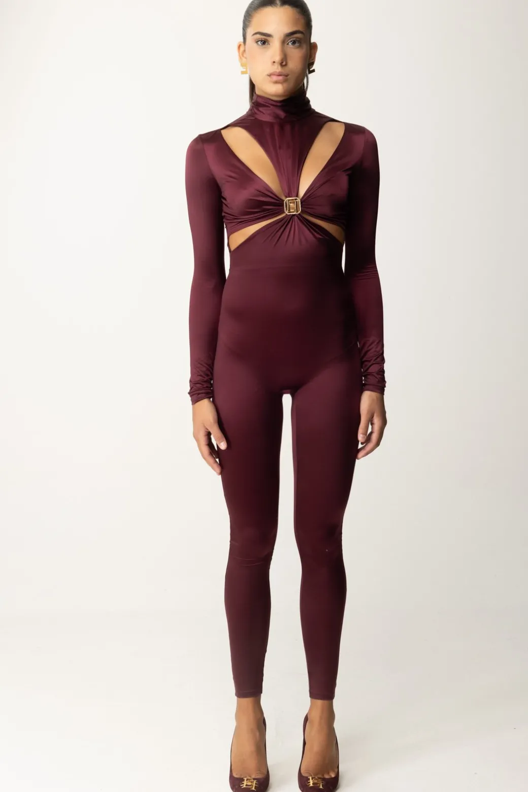 Questa tuta Elisabetta Franchi è audace e sensuale, realizzata in lycra lucida con un design a collo alto, maniche lunghe e cut-out sul petto e fianchi che rivelano la pelle esaltando ancor di più la silhouette che viene messa già in risalto dal fit aderente. Il logo gold con strass al centro dona un tocco sofisticato e rende la tuta perfetta per eventi serali o party di lusso.