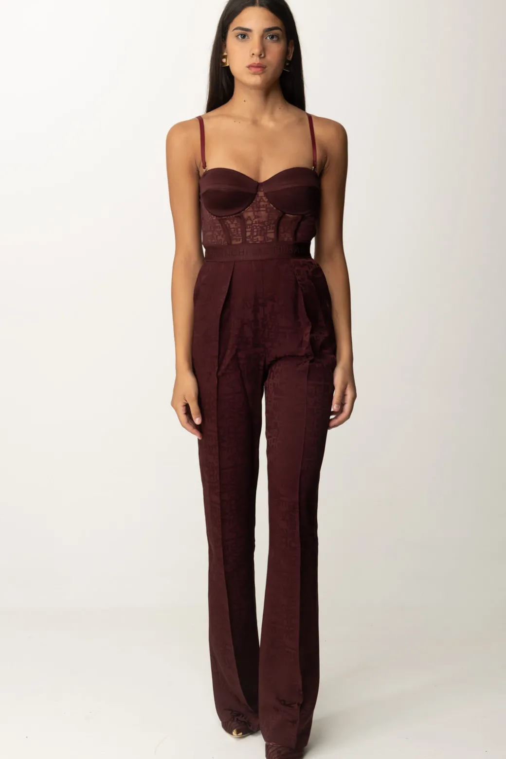 Impeccabile, elegante, ricercata: e altrettanto sarai tu, scegliendo questa tuta lunga Elisabetta Franchi. Un unico pezzo che mette insieme un top bustier in tulle e un pantalone palazzo, e utilizza la trama lettering come trait d’union. Scegli tacchi alti per rendere l’outfit ancora più monumentale, i giusti bijoux per dare luce all’insieme e un blazer da indossare come capospalla all’occorrenza: sarai perfetta.
