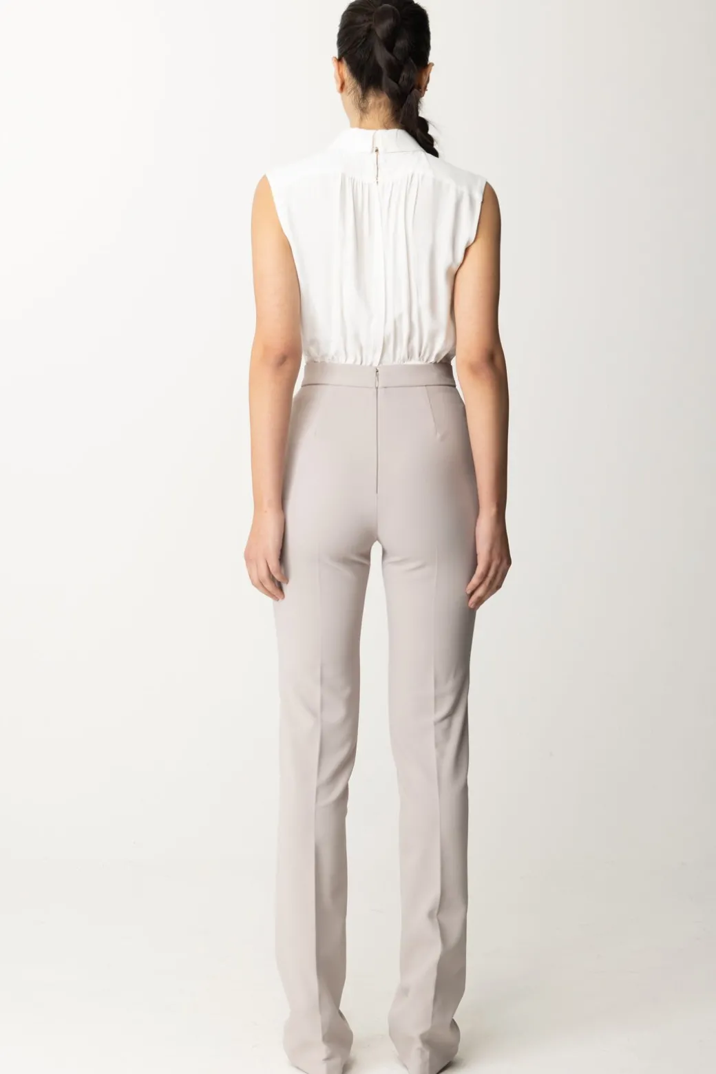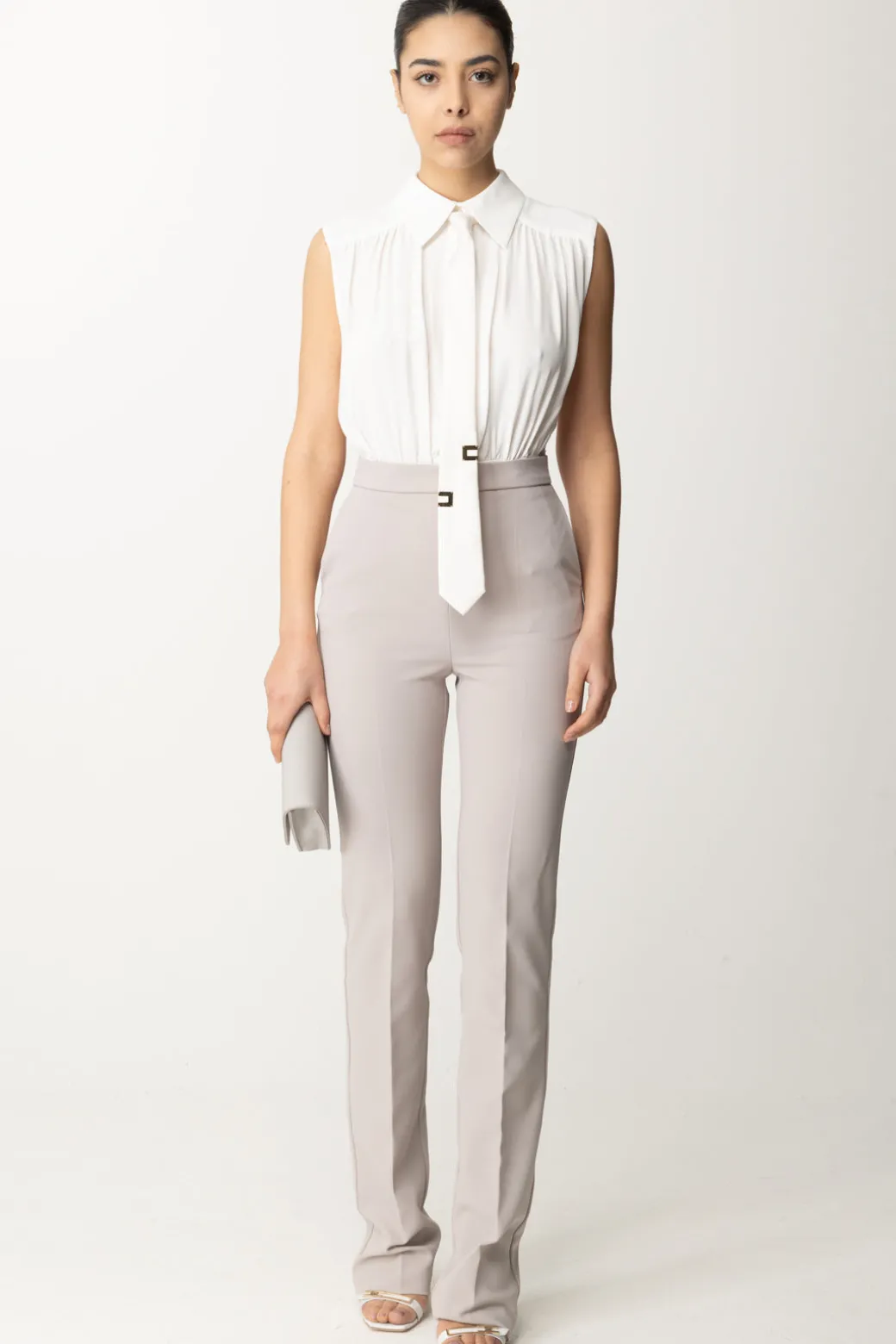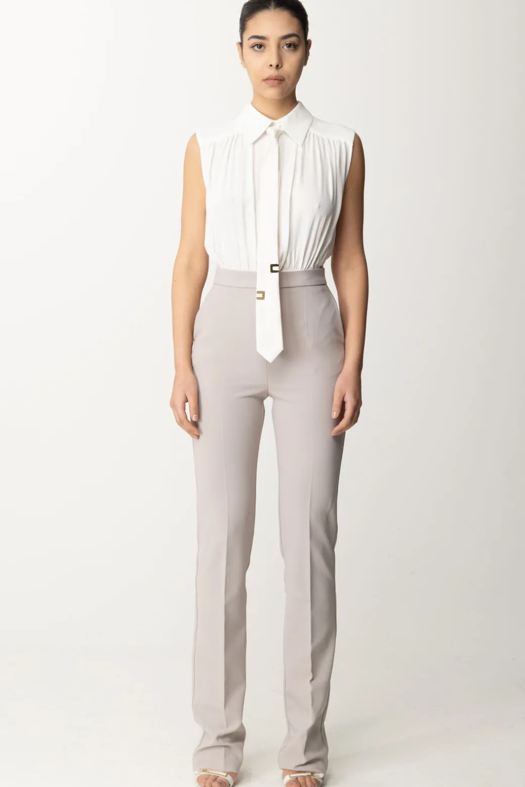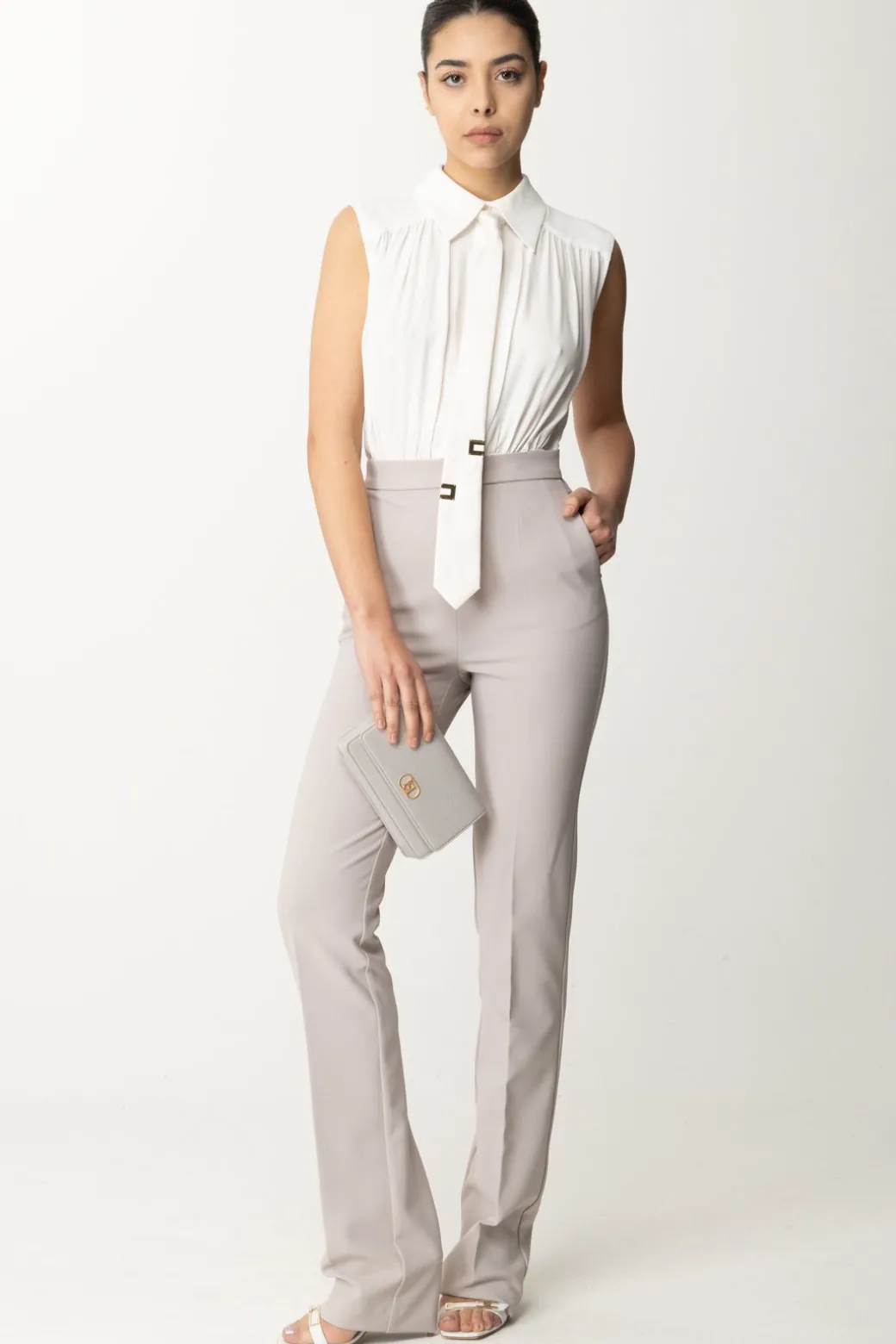 Allure estremamente business per questa tuta Elisabetta Franchi che sembra quasi un completo da lavoro, sebbene tu potrai indossarla in tantissime occasioni. Elegante e raffinata, il top smanicato a contrasto ha un volume morbido e un accessorio cravatta logato rimovibile, così da poter cambiare mood al tuo outfit all’occorrenza.
