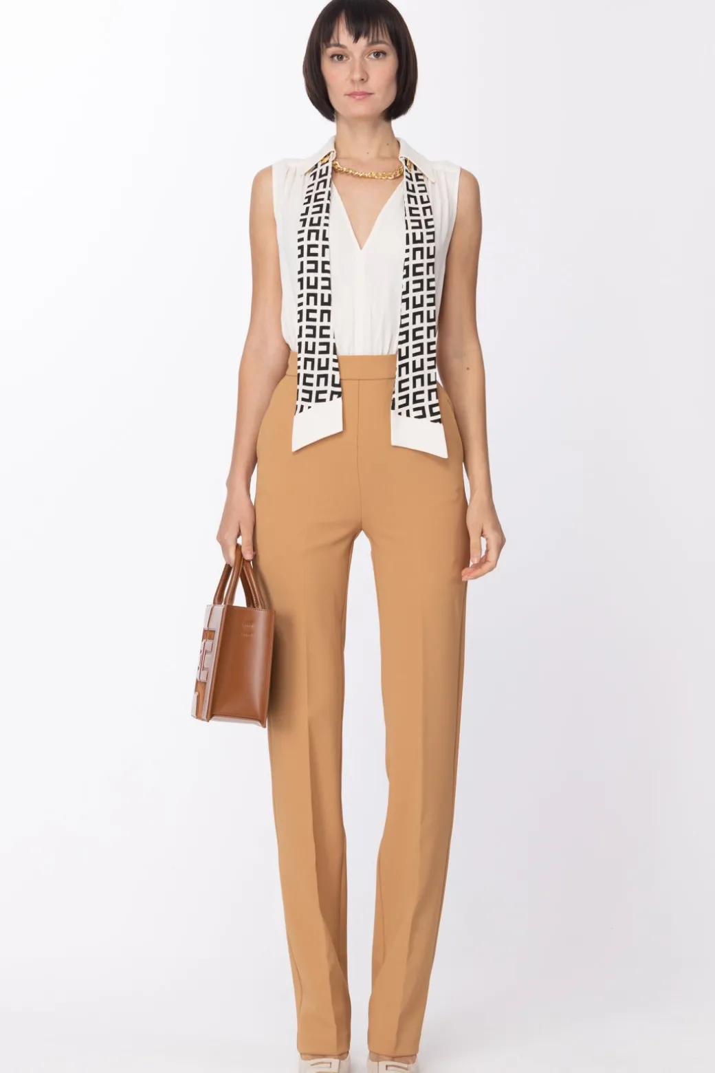 La soluzione perfetta per un’occasione formal chic: è la tuta Elisabetta Franchi. Un modello lungo in crepe stretch, con pantalone a gamba dritta, camicia smanicata in georgette, con profondo scollo a V, impreziosito da un foulard a stampa lettering e una catena gioiello in metallo dorato. Abbinala ad un bel paio di tacchi e ad una pochette e sarai pronta per la serata!