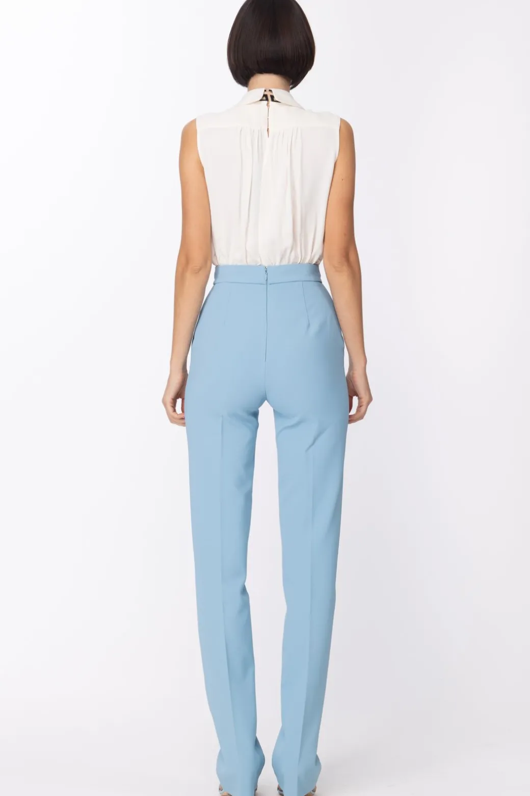 La soluzione perfetta per un’occasione formal chic: è la tuta Elisabetta Franchi. Un modello lungo in crepe stretch, con pantalone a gamba dritta, camicia smanicata in georgette, con profondo scollo a V, impreziosito da un foulard a stampa lettering e una catena gioiello in metallo dorato. Abbinala ad un bel paio di tacchi e ad una pochette e sarai pronta per la serata!