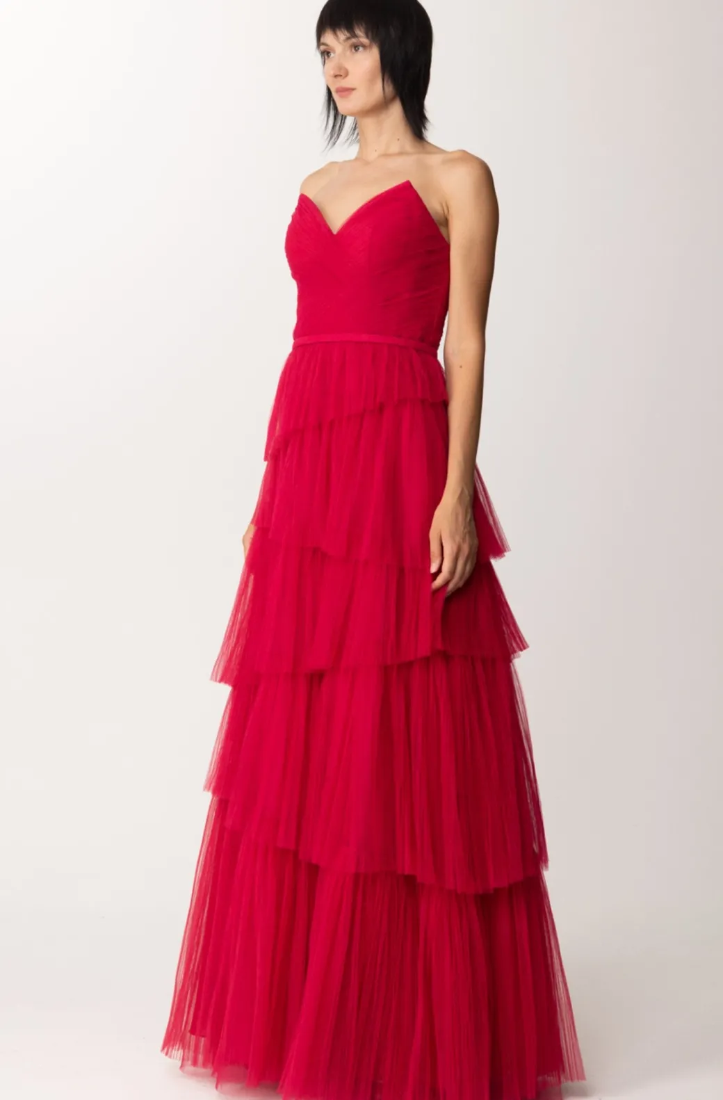 Scollo a diamante, taglio alto in vita e vaporosi strati in tulle asimmetrici, con cui esprimere tutta la propria femminilità.